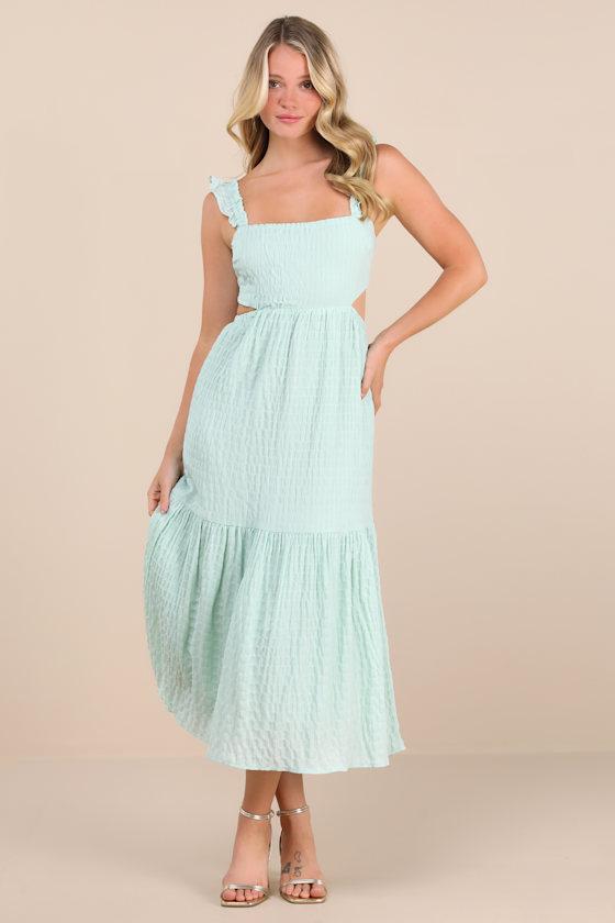 The cutest way to start the day.This summery smocked dress features a breezy midi silhouette that’ll be perfect for the warmer weather. Linen-like fabric shapes a sleeveless bodice with ruffled elasticized straps and long sashes that secure atop the open back, creating flirty cutouts at the elasticized waist, all above a tiered A-line skirt.