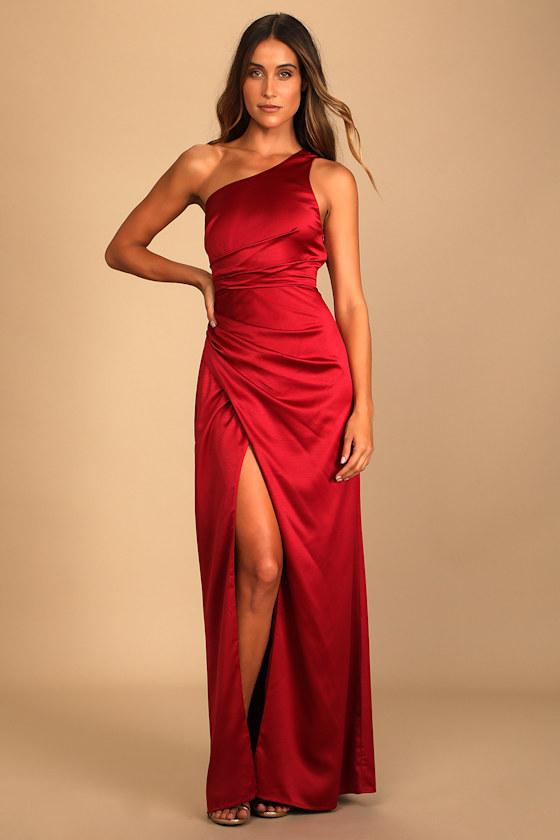 Make your night a stunning one with the Lulus Dreaming of Elegance Wine Red Satin One-Shoulder Maxi Dress! Sleek woven satin shapes this luxe dress that falls from a wide strap into a one-shoulder neckline and a lightly gathered bodice. A fitted waist tops an overlapping A-line maxi skirt that creates a sexy front slit. Hidden side zipper/clasp.