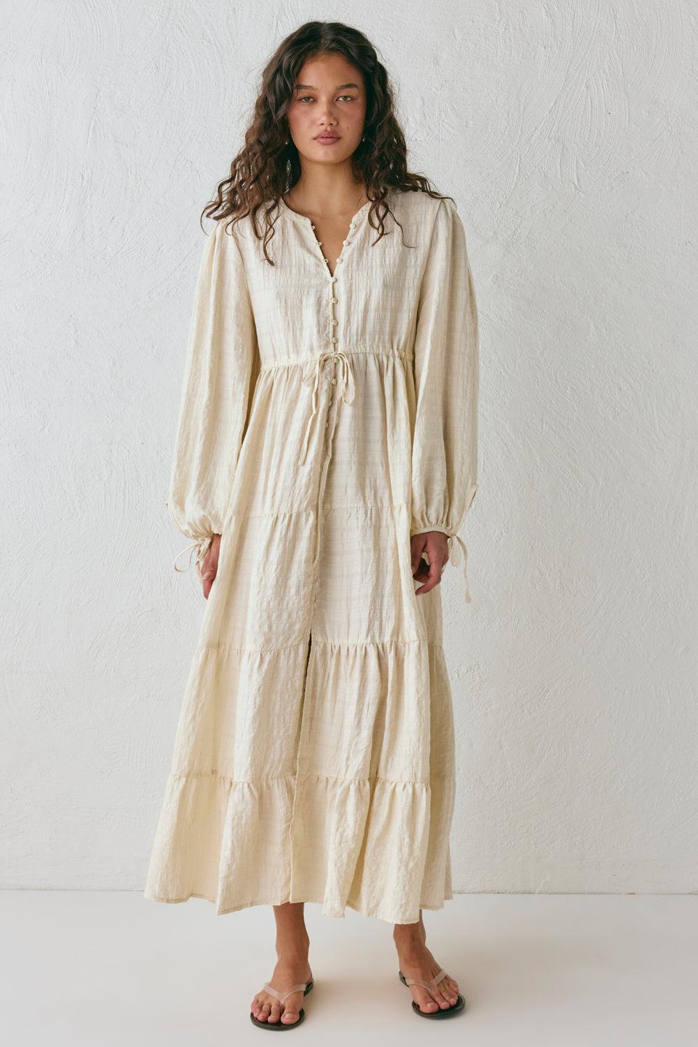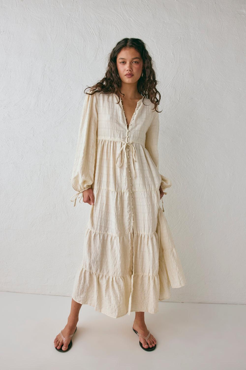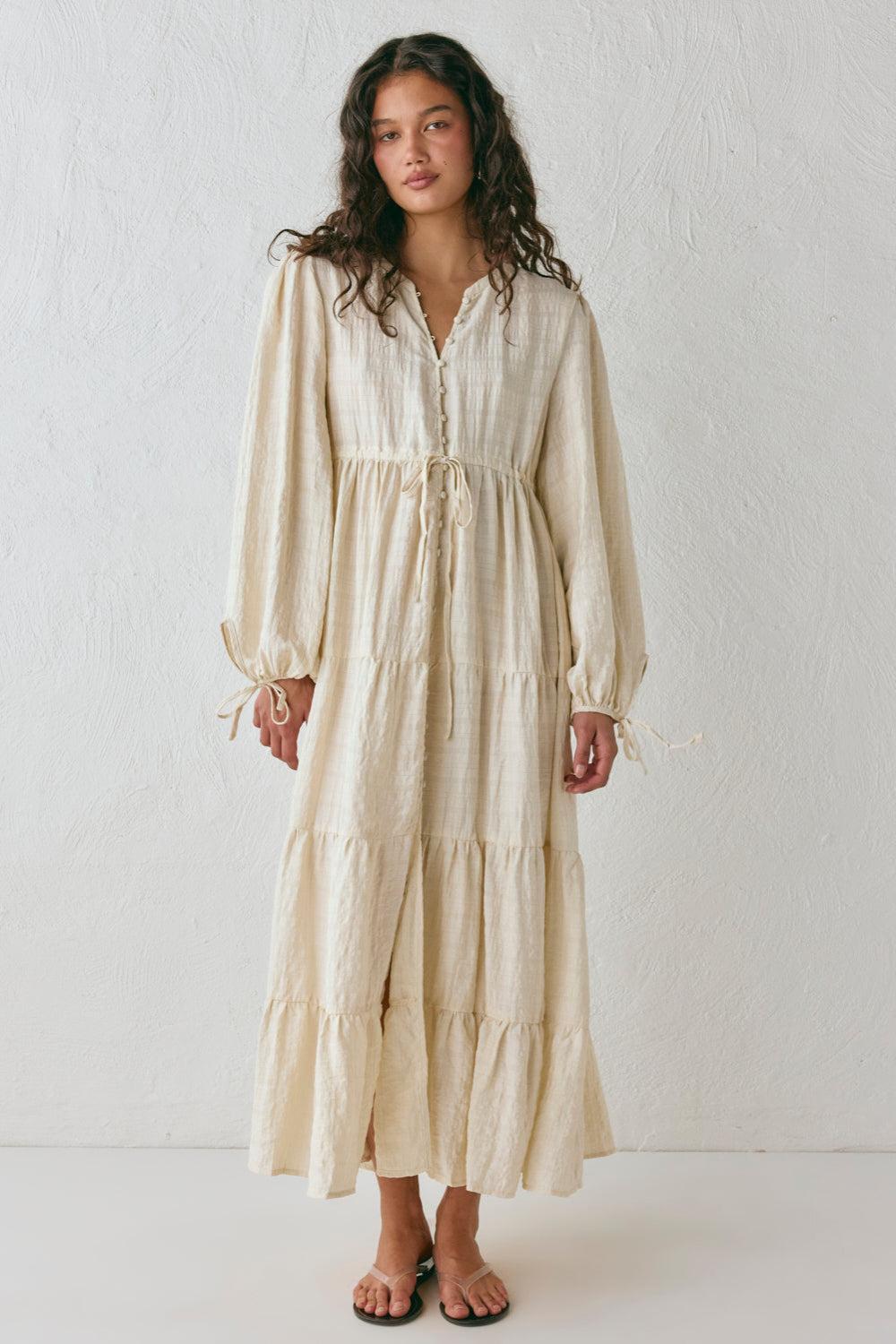 Dreaming Of Travel Midi Dress in Natural features centre front buttons, adjustable drawstring waist & tie-up cuffs. Designed in Australia.