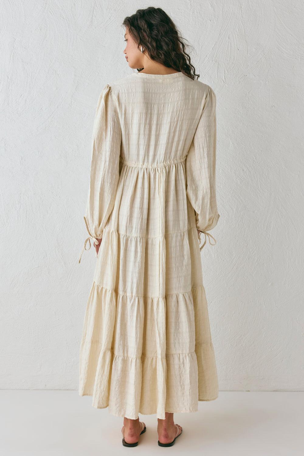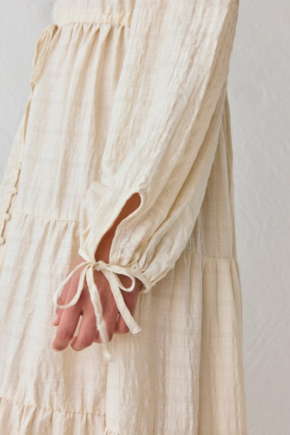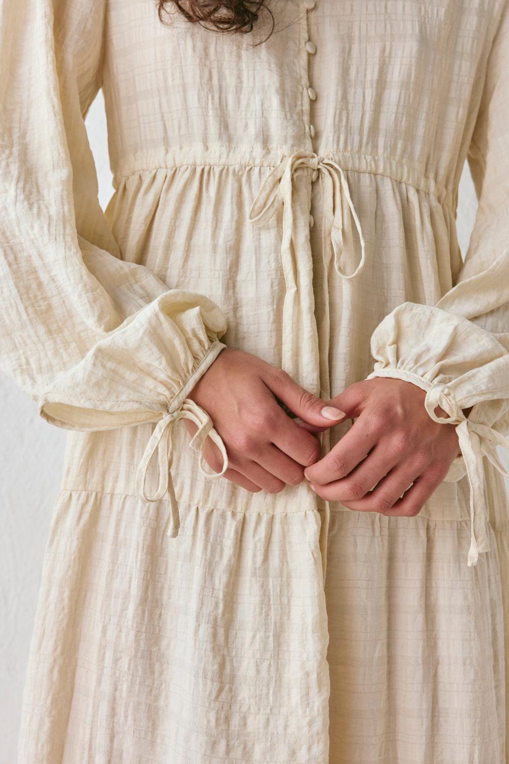 Dreaming Of Travel Midi Dress in Natural features centre front buttons, adjustable drawstring waist & tie-up cuffs. Designed in Australia.