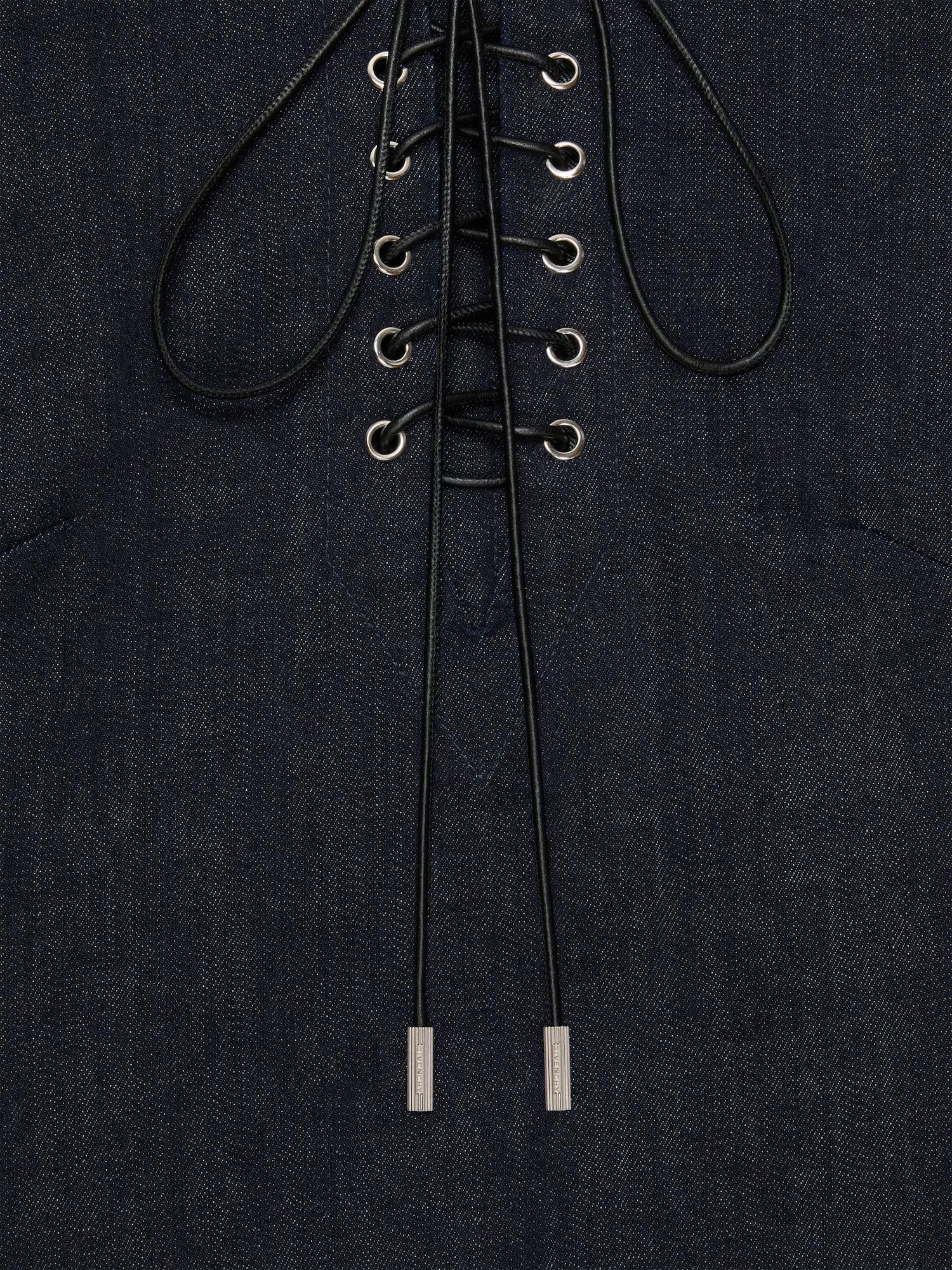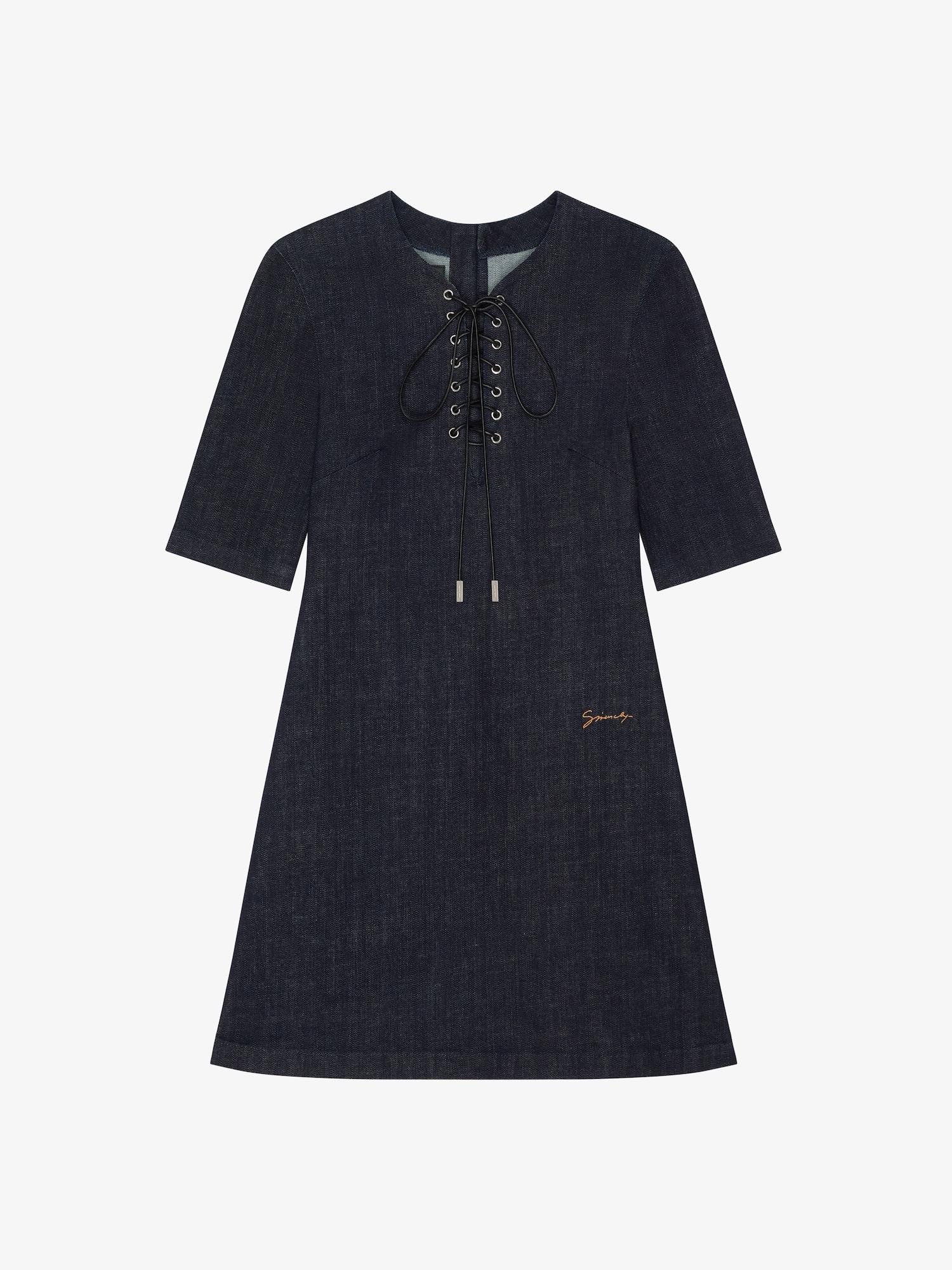 Inspired by Hubert de Givenchy's 70s era, lace-up details punctuate the collection, infusing it with a touch of sensuality and femininity. Short dress with short sleeves in denim. Crew neck. Front laces with GIVENCHY engraved metal tips. Small GIVENCHY signature embroidered on the front. Invisible zipped closure on the back. Model measures 5.8 Feet and wears a size 36.