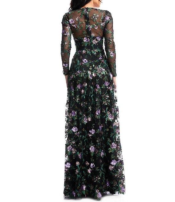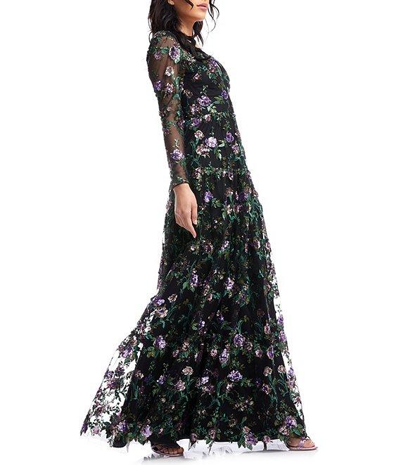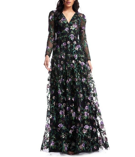 From Dress the Population, this gown features: Fit & flare silhouette V-neckline Long blouson sleeves Floral embroidery Fully lined Straight hemline Back zipper closure Approx. 60.5" length Polyester Hand wash Imported.