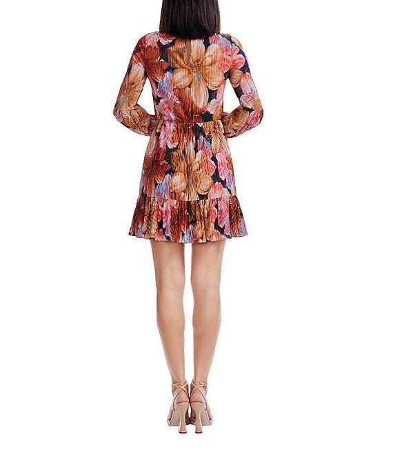 From Dress the Population, this dress features: Plisse knit fabrication Fit & flare silhouette Floral print High neckline Long blouson sleeves Elasticized waist Fully lined Ruffle tiered hemline Back hook & eye closure Approx. 34.25" length Polyester; lining: polyester Hand wash Imported.