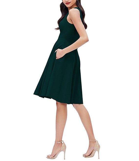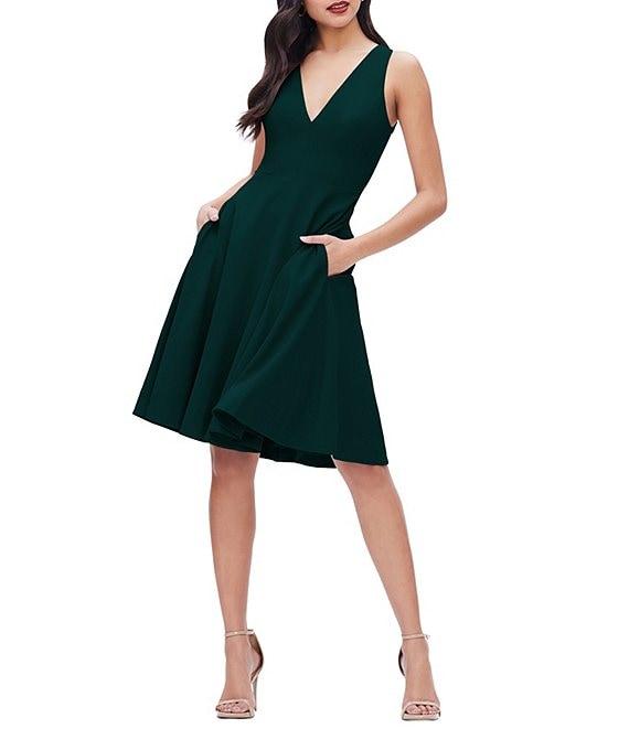From Dress the Population, this dress features: Crepe fabrication A-line silhouette V-neckline Sleeveless side-seam pockets Center back zipper closure Polyester/spandex Machine wash/dry flat Imported.