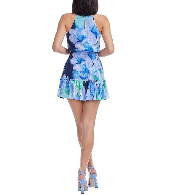 Dress the Population Kaylee Halter Neck Sleeveless Floral Print Georgette Smocked Waist Blouson Mini Dress