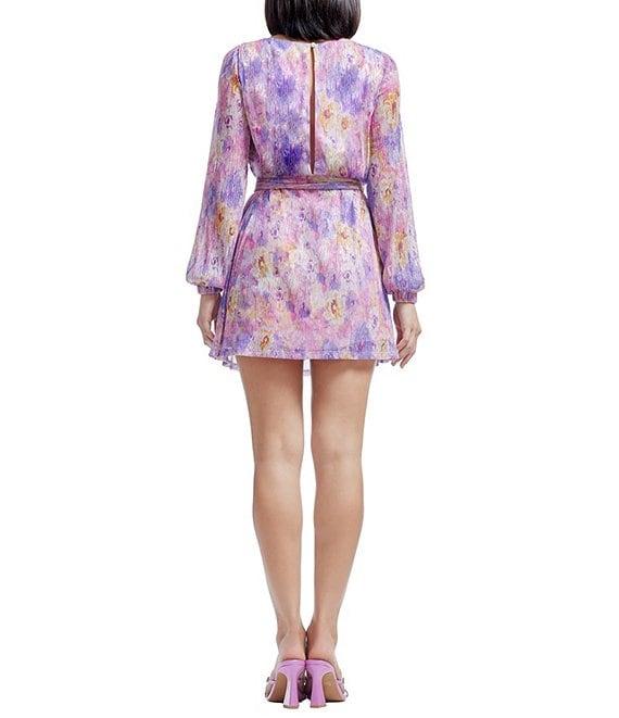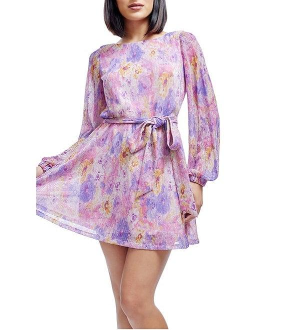 From Dress the Population, this dress features: Metallic fabrication Floral print Blouson silhouette Crew neckline Long sleeves Belted waist tie Lined Back hook and eye closure Approx. 32.75" length Polyester/metallic/rayon Machine wash/line dry Imported.