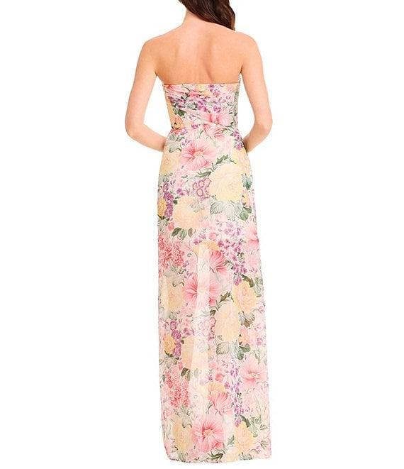 From Dress the Population, this gown features:Column gown silhouetteMetallic chiffon fabricationFloral motifStraplessRuched bodiceDrape front detailFront slitIllusion hemZip back closureLinedApprox. 54" length Polyester/metallicMachine wash coldImported.