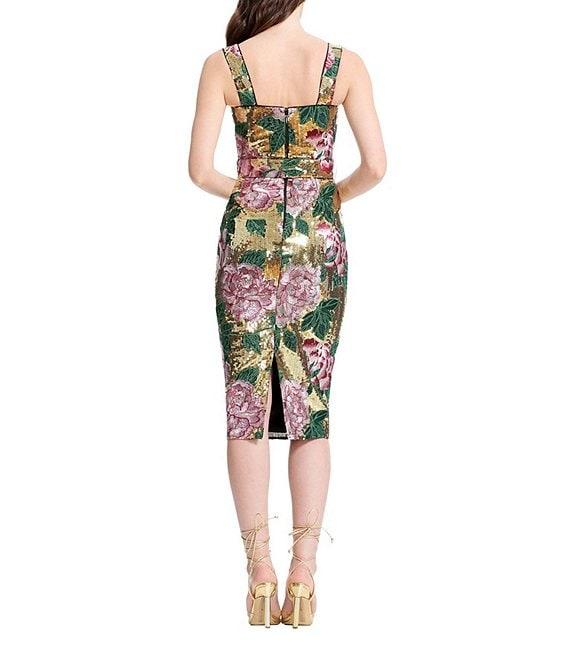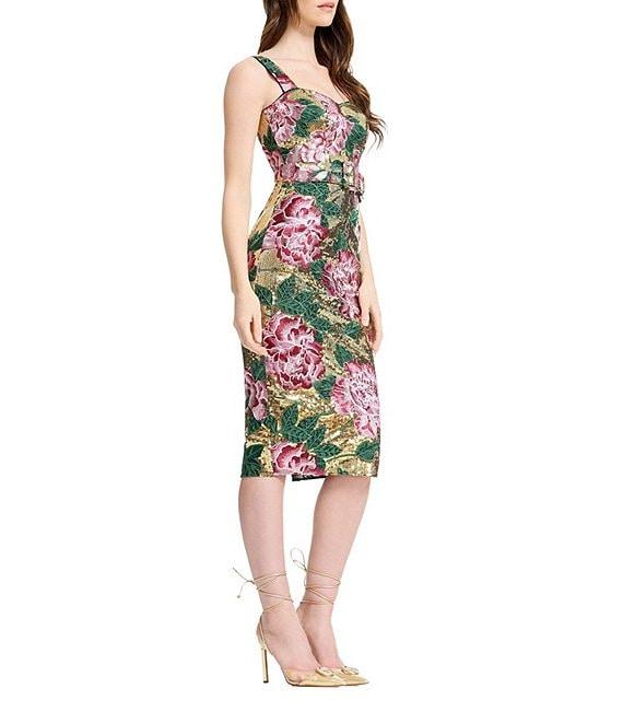 Dress the Population Nicole Sequin Sweetheart Neckline Floral Belted Sheath Midi Dress
