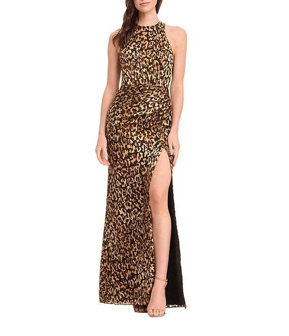 Dress the Population Nilla Halter Cowl Back Ruched Sheath Gown With Front High Slit