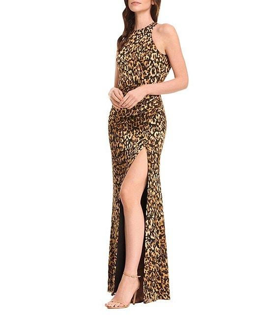 From Dress the Population, this dress features: Satin fabrication Sheath silhouette Halter neckline Cowl back Sleeveless High front slit Zip back closure Approx. 61" length Viscose/Polyester Machine wash cold Imported.