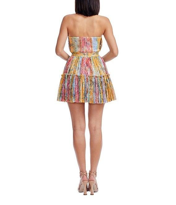 From Dress the Population, this dress features:Metallic knit fabricationFit & flare silhouetteStrapless neckline SleevelessPleated detailBow waist detailFully lined Straight hemline Center back zip closure Approx. 26.5" lengthPolyester/spandexMachine washImported.