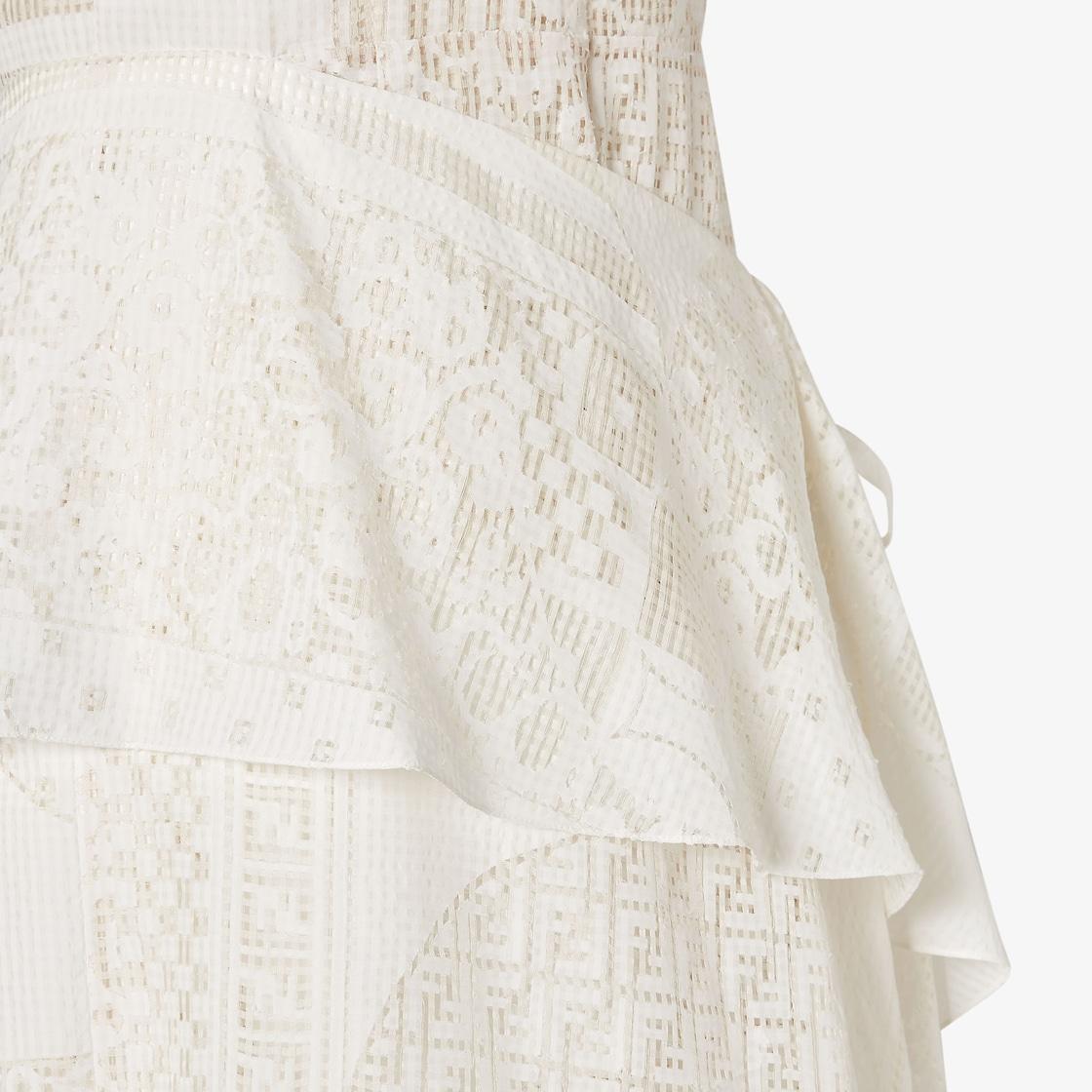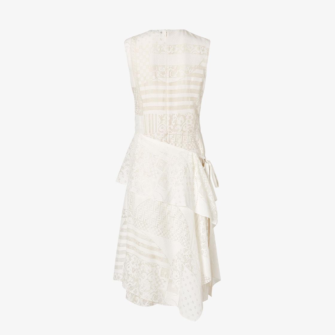 Sleeveless midi dress, featuring a side panel to tie at the waist for a wrap-over effect or left free at the side to create an asymmetric volume on the side. Lined in silk. Made of white viscose and silk with a burnout patchwork motif that depicts a combination of logos and archive patterns. Made in Italy