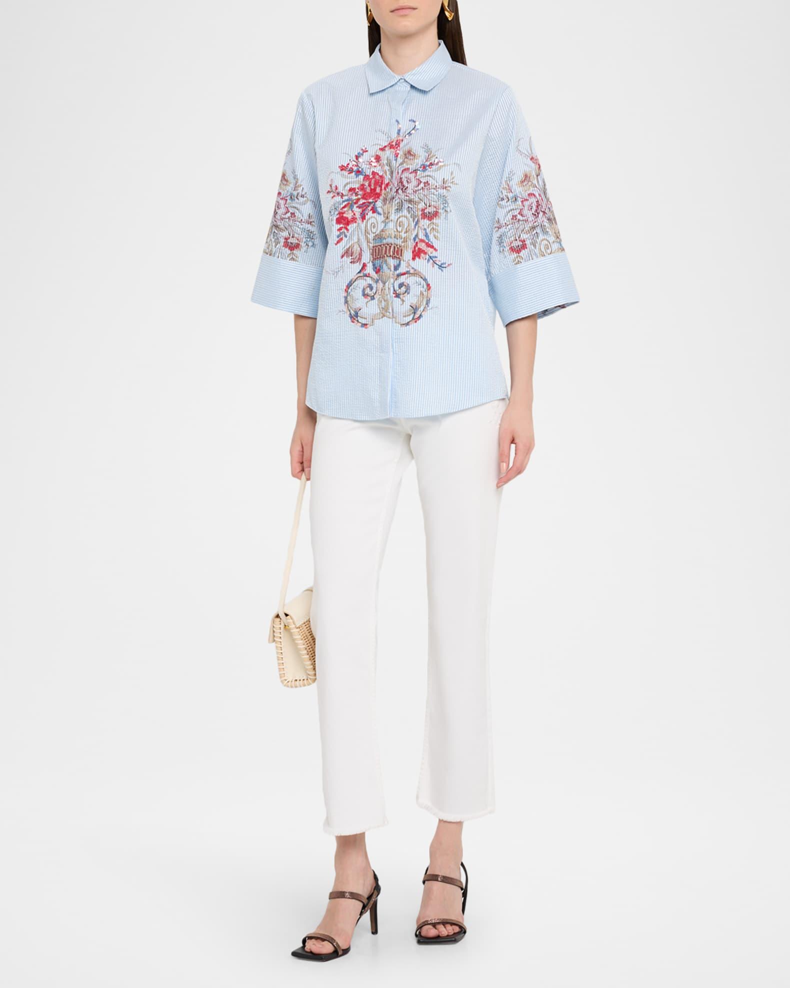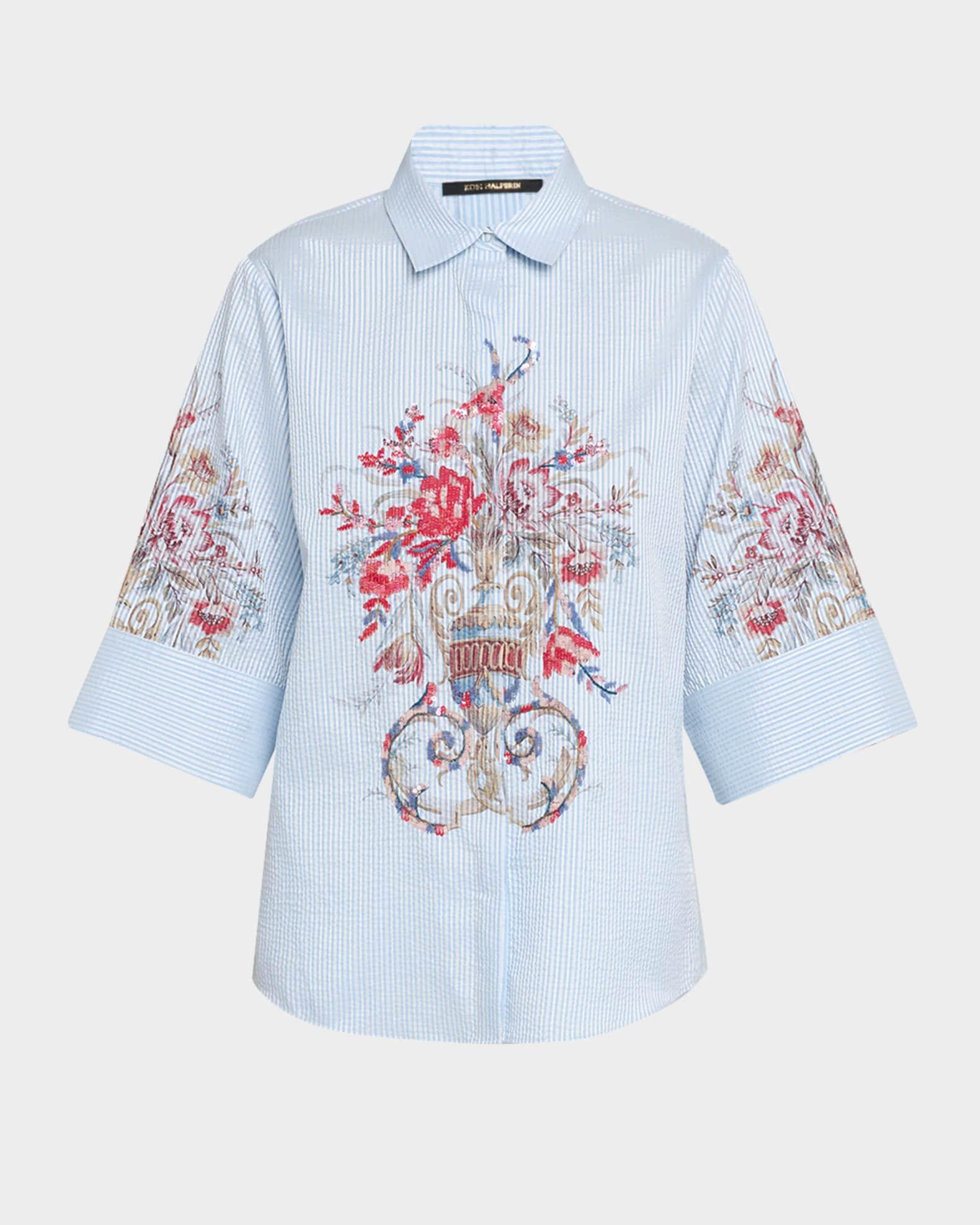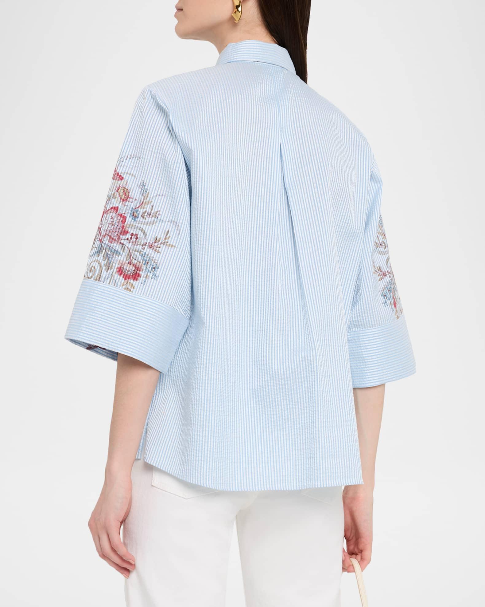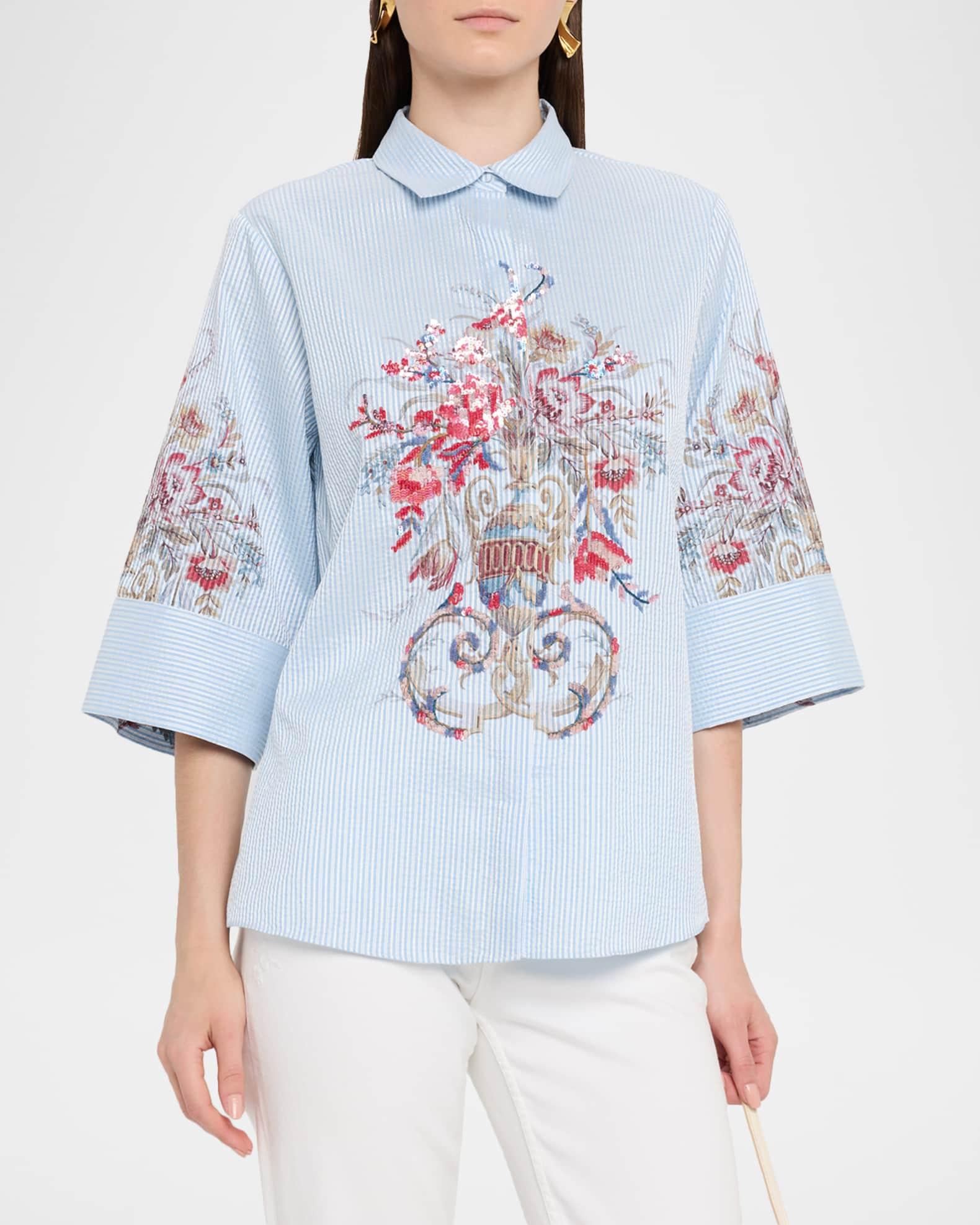 Crafted in seersucker, the "Drew" blouse from Kobi Halperin features vertical stripes, printed florals, and sequin embroidery embellishments Spread collar; concealed button front 3/4 wide sleeves Back inverted pleat Rounded side-slit hem Relaxed fit Cotton/viscose Dry clean Imported