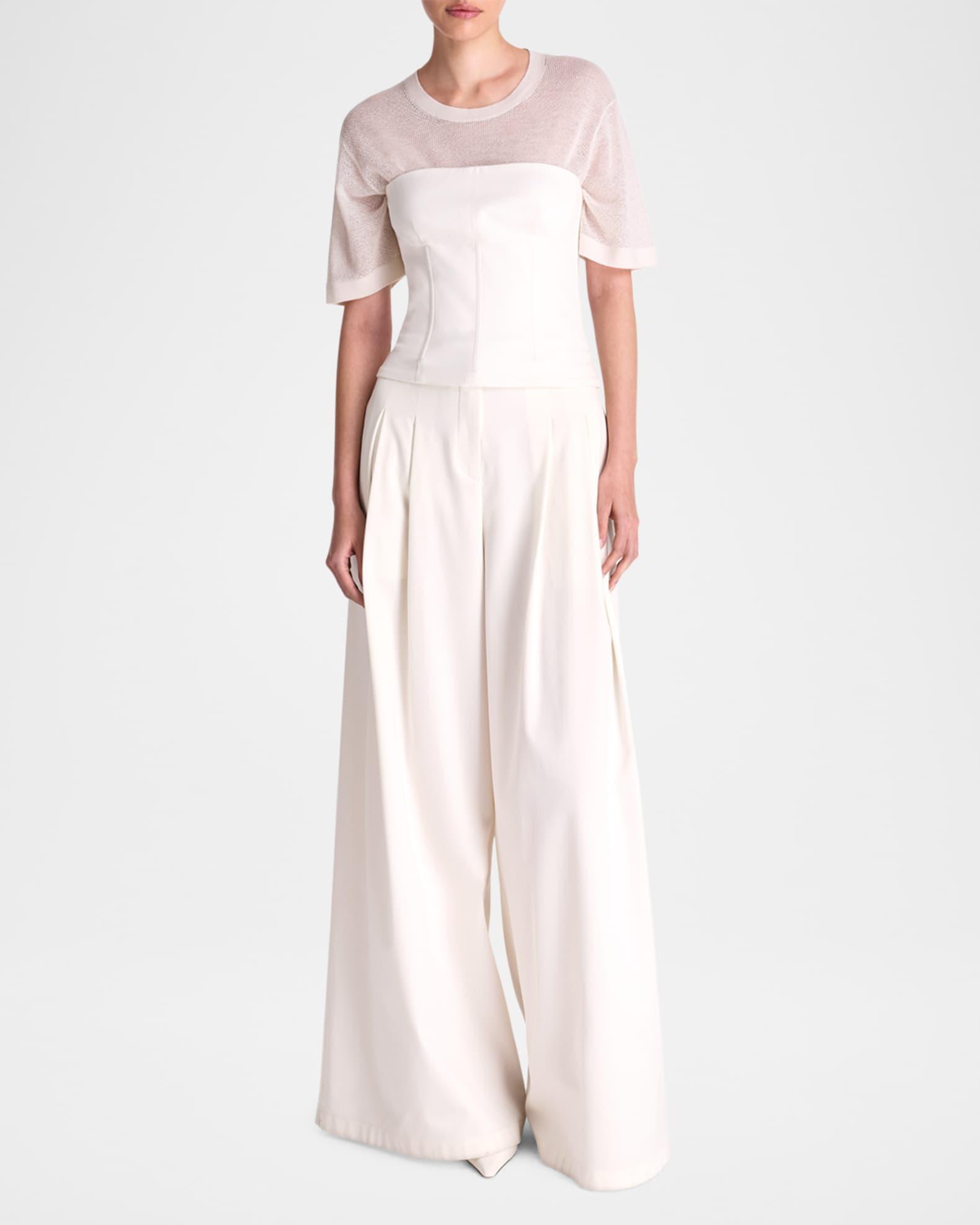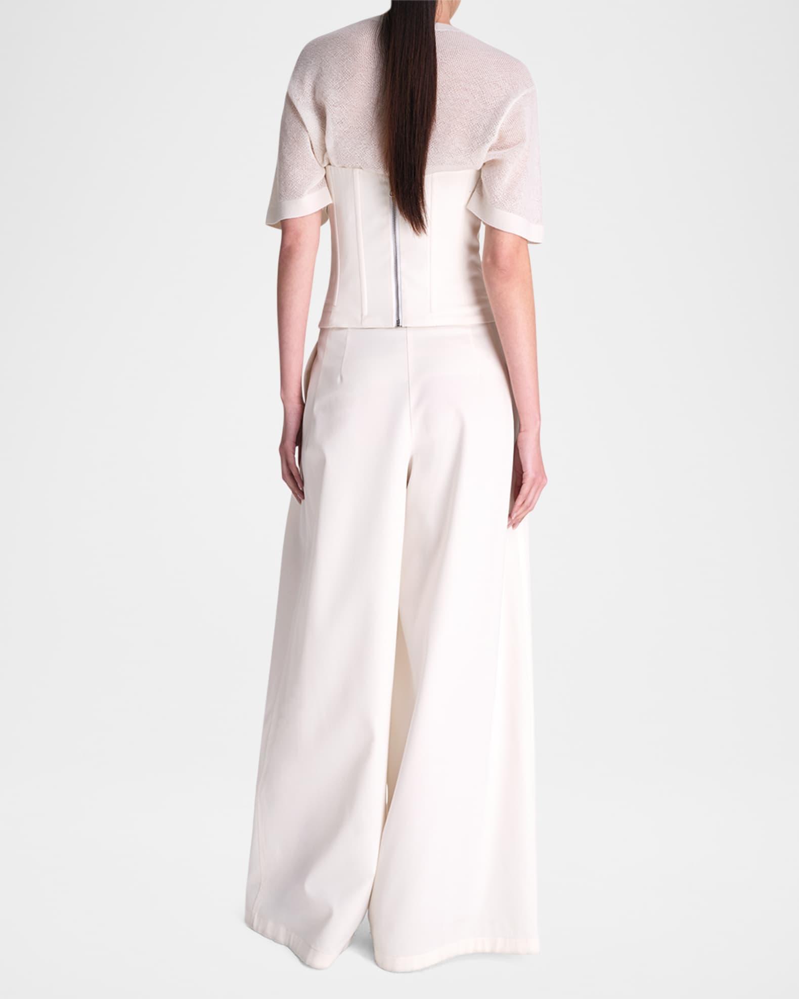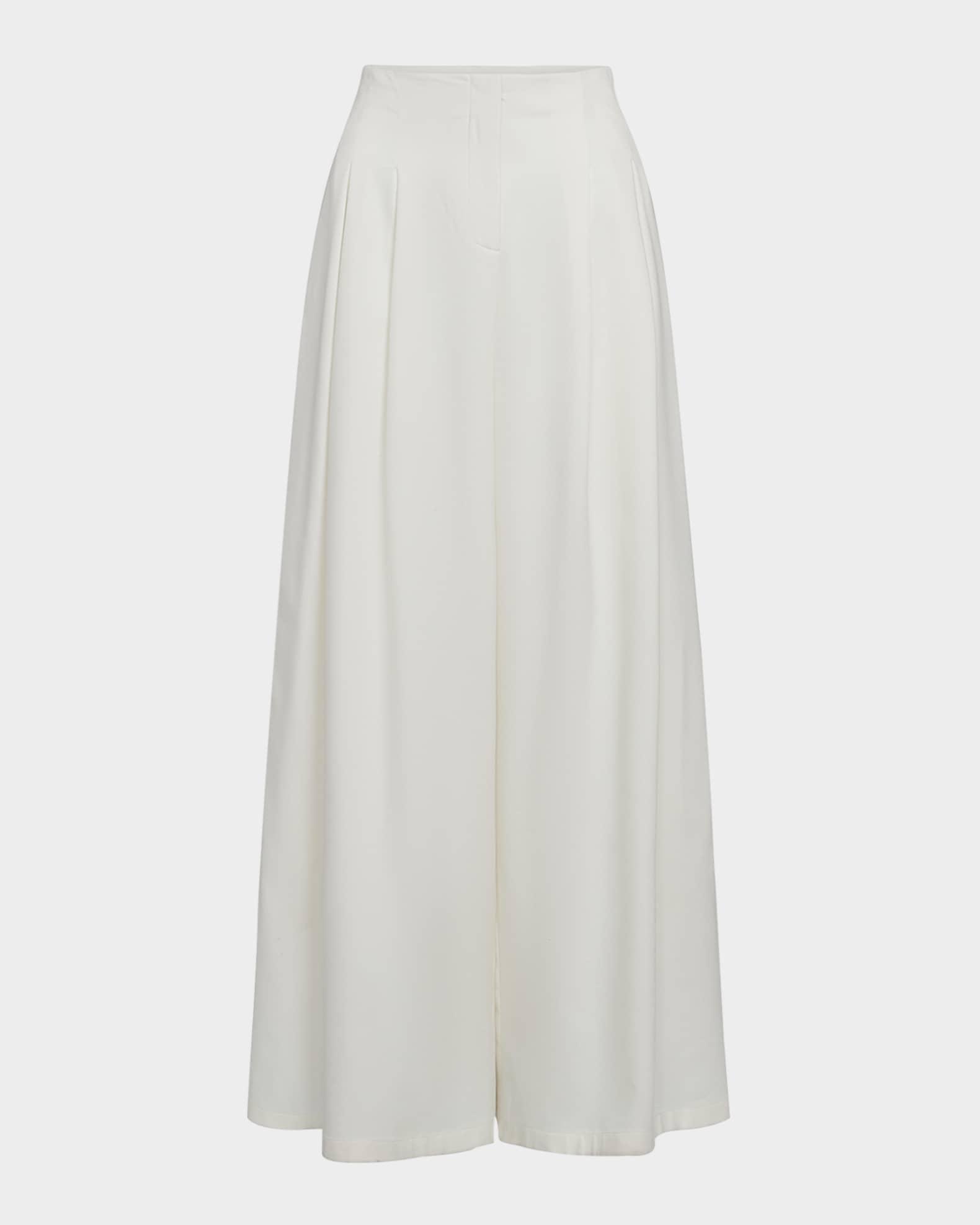 TWP "Drew" pants boast front pleats and an exaggerated silhouette High rise Side slip pockets Full length Wide legs Hook-and-bar/zip fly Cotton/wool/elastane Made in USA from imported materials