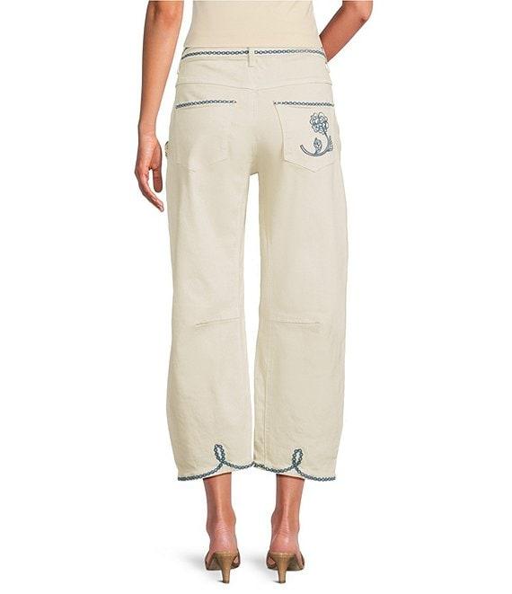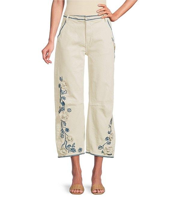 From Driftwood, these jeans feature: Stretch denim fabrication Wide leg silhouette Embroidery and floral applique detail Front patch functional pockets & back functional pockets Crop length Button and zipper closure Approx. 26" inseam Cotton/spandex Machine wash Imported.
