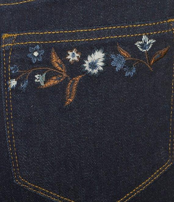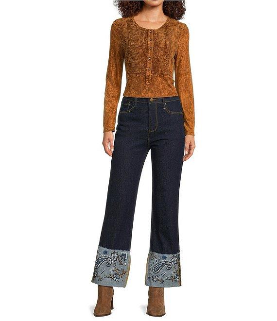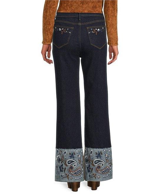 From Driftwood, these jeans feature: Stretch denim fabrication Wide leg silhouette Paisley print Belt loops Embroidery detail 5 pocket styling Wide leg Ankle length Cuffed hemline Front button and zipper closure Approx. 30" inseam Cotton/polyester/spandex Machine wash Imported.