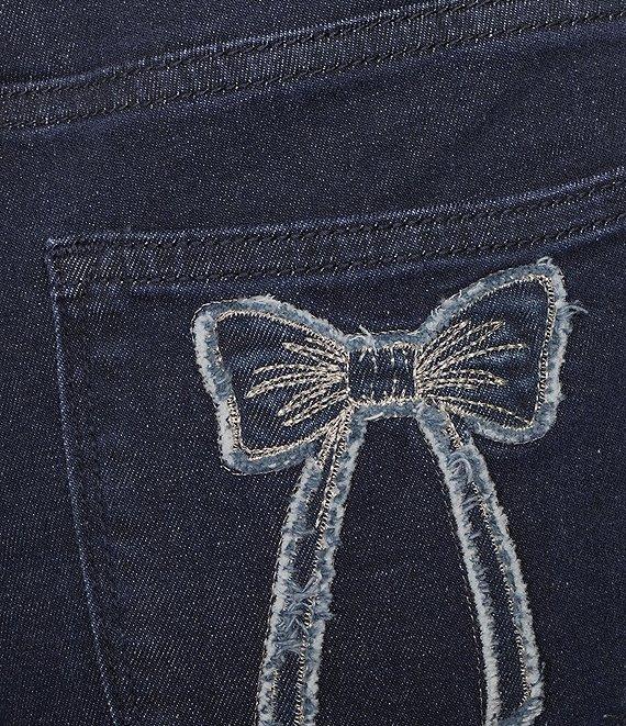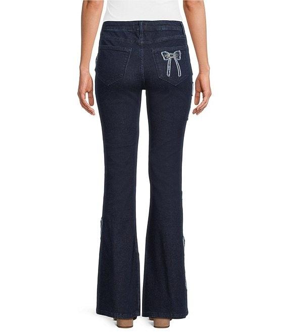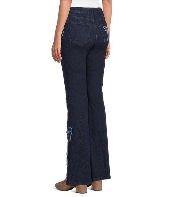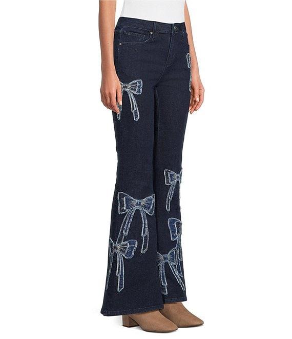 From Driftwood, these jeans feature: Stretch denim fabrication Wide leg silhouette Patchwork with metallic 3D bow Belt loops 5 pocket styling Full length Front button and zipper closure Approx. 32.5" inseam Cotton/polyester/spandex Machine wash cold/tumble dry low Imported.