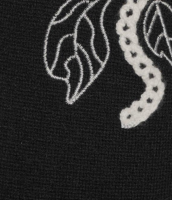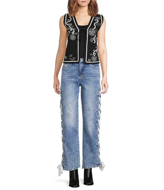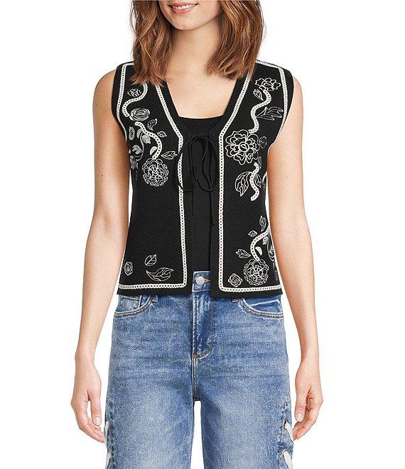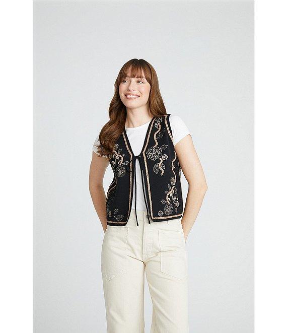 From Driftwood, this sweater vest features: Knit fabrication V-neckline Sleeveless Embroidery details Straight hemline Tie front closure Approx. 22" length Cotton Machine wash Imported.