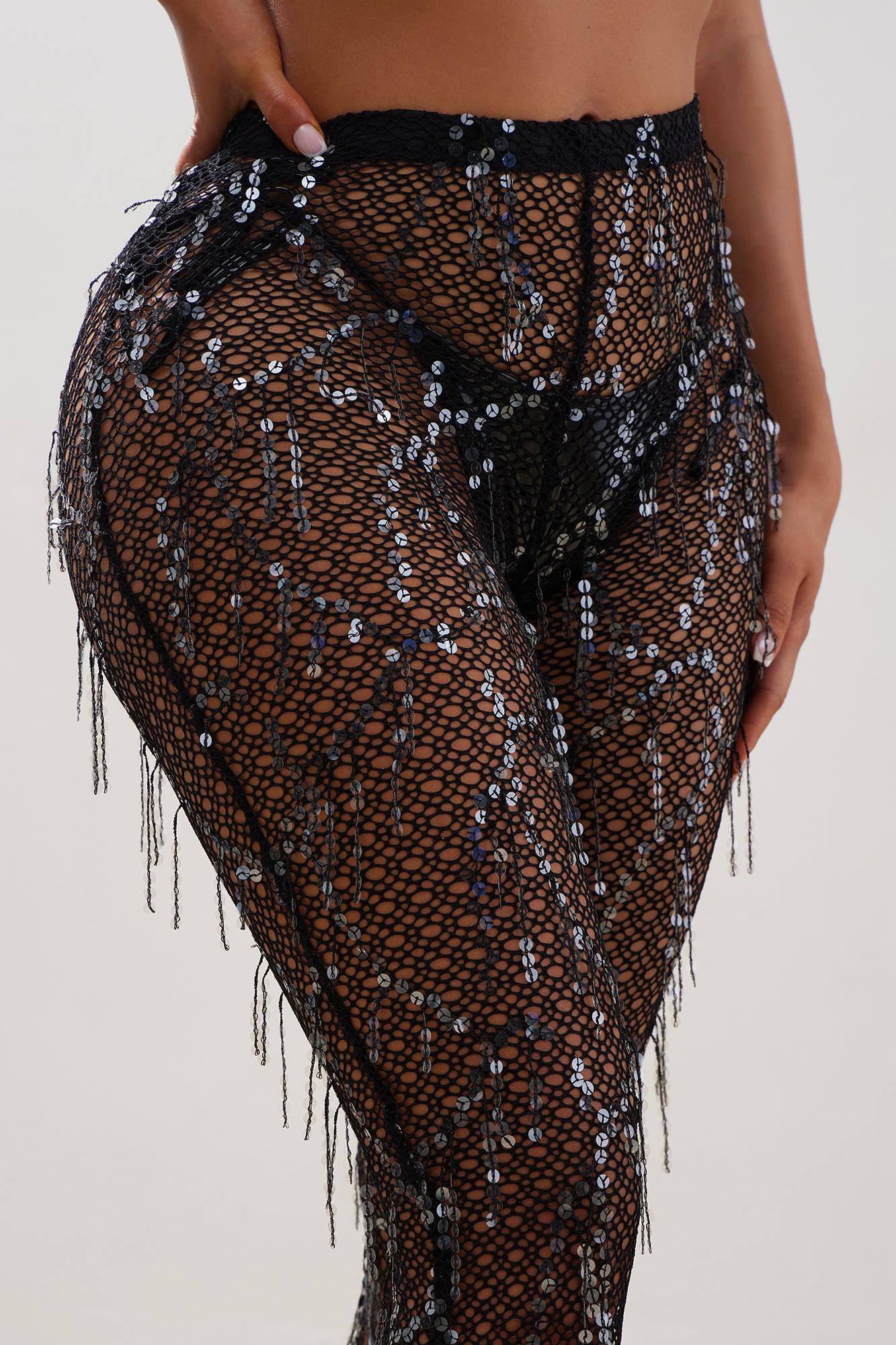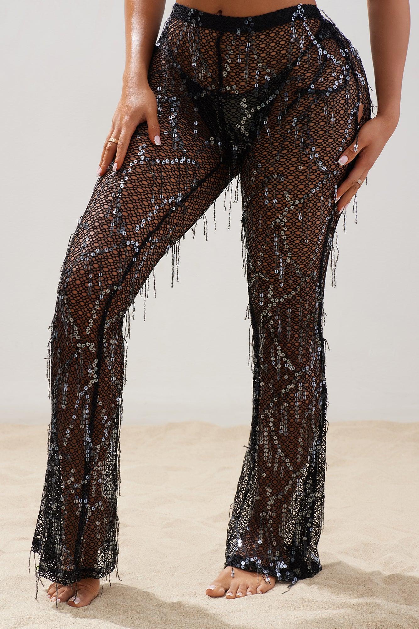 Available In Black And Mocha. Swim Cover Up Pants Sequin Crochet Sheer Elastic Waistband Semi-Flared Leg Stretch Final Sale Shell: 95% Polyester 5% Spandex Imported California Proposition 65WARNING: Cancer and Reproductive Harm - www.P65Warnings.ca.gov.