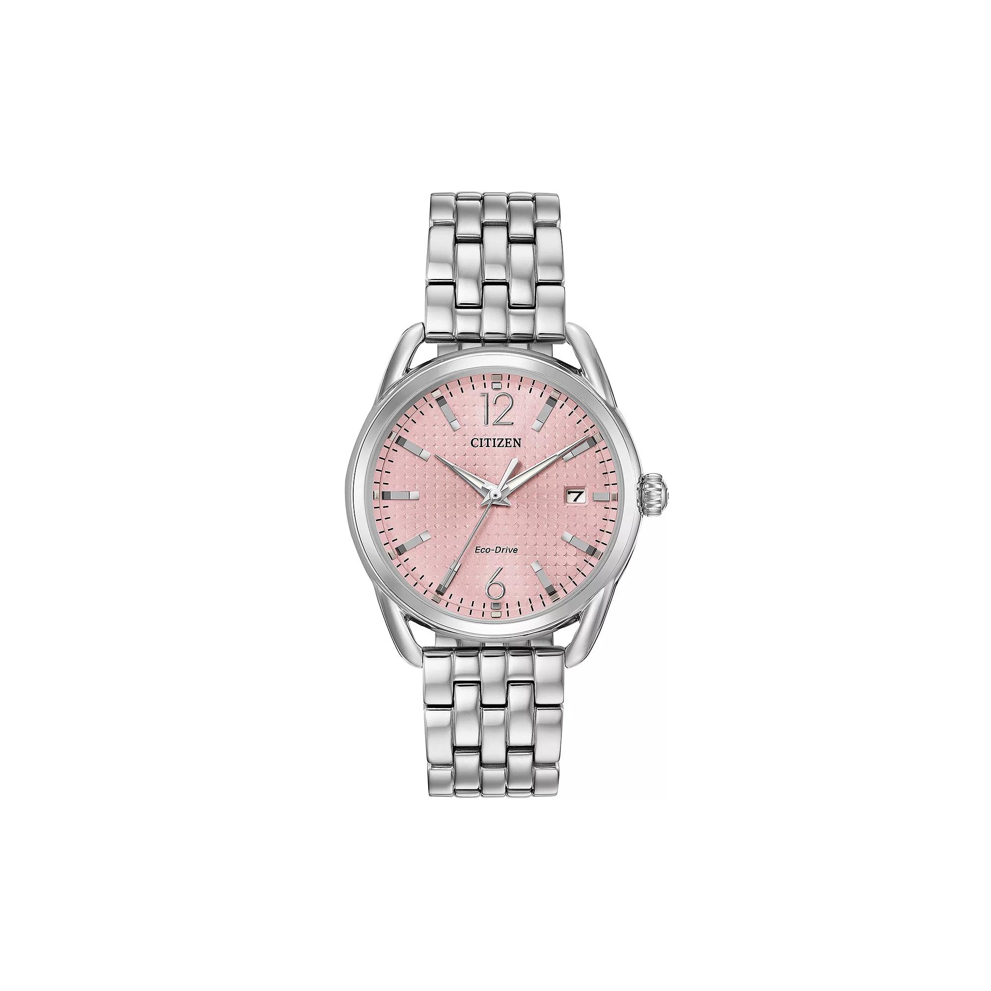 Make room in your watch collection for the new Drive from Citizen timepieces. The LTR timepiece, a fresh staple to your every day watch wearing with clean lines and simplistic detailing. Featured here in a stainless steel case and bracelet, light pink dial and date. Featuring our Eco-Drive technology – powered by light, any light. It never needs a battery. Caliber number J810. | Citizen Women's Stainless Steel Drive Eco-Drive Bracelet Watch, Silver