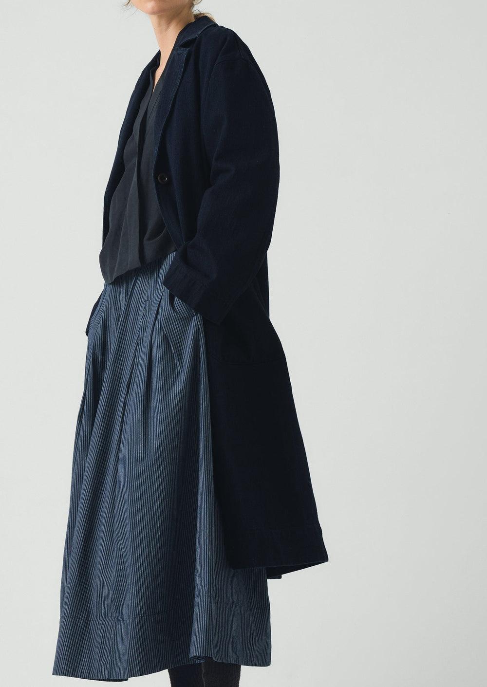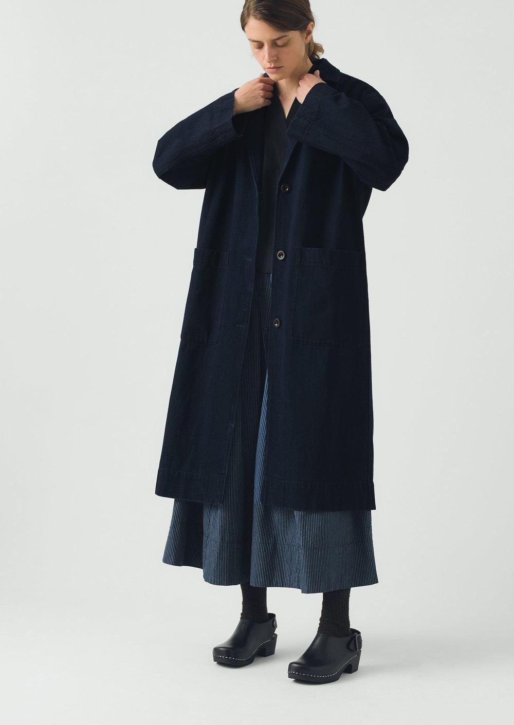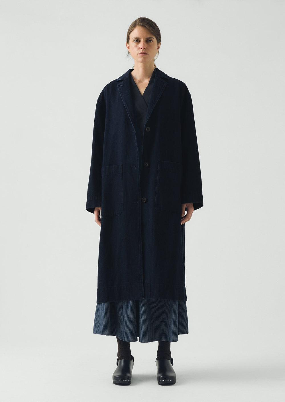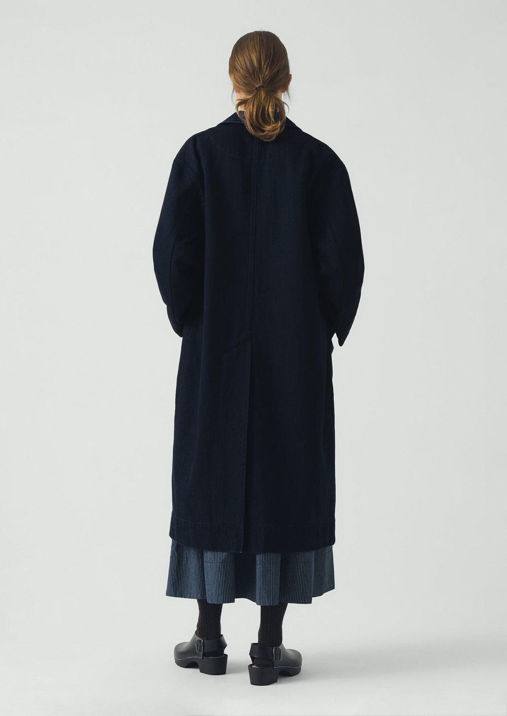 Japanese cotton denim. Elongated silhouette. Mid-calf length. Wide revere. Welt pockets. Corozo buttons.
