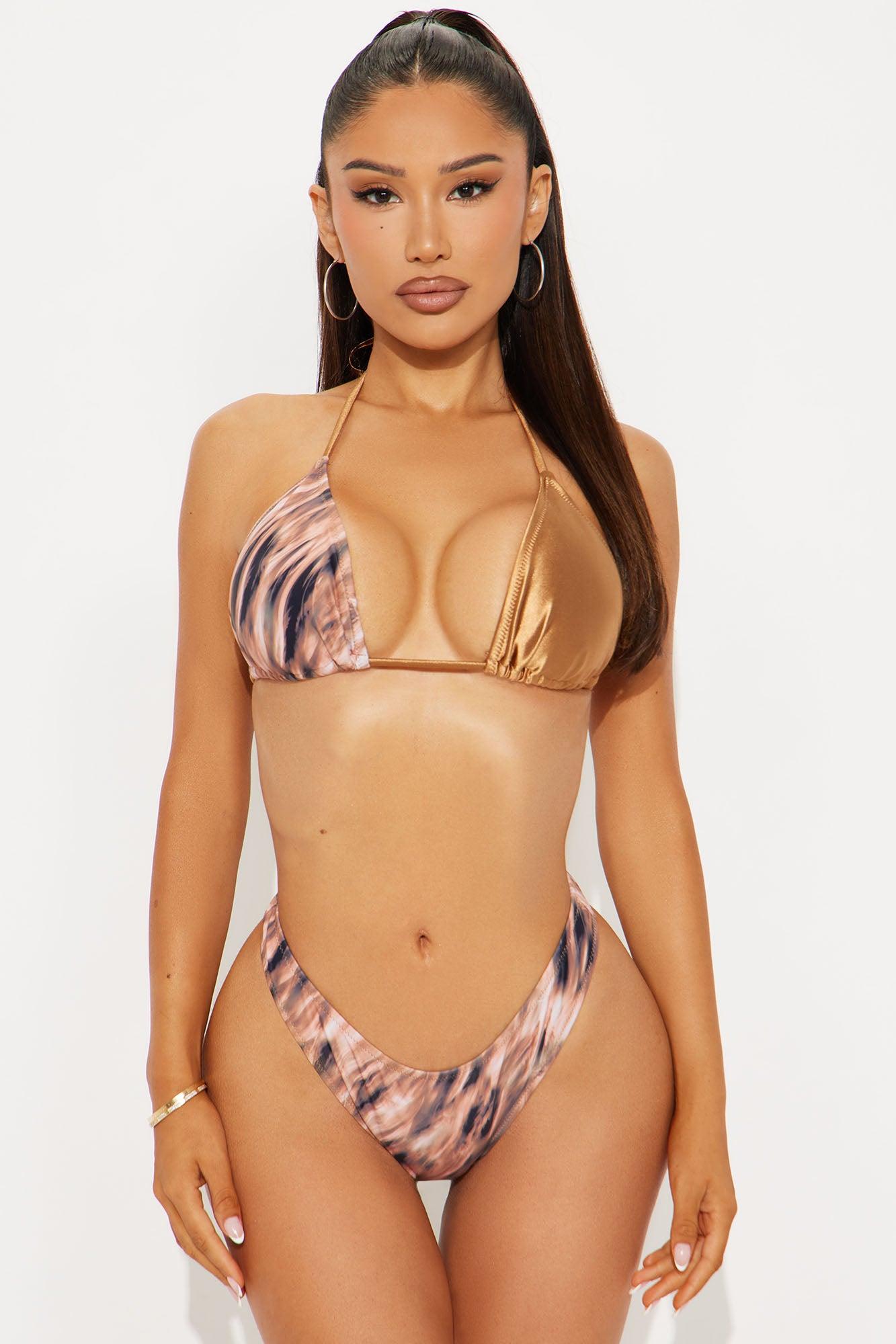 Available In Brown/combo. 4 Piece Bikini Set Triangle Bikini Top Metallic Abstract Print Removable Cups Bikini Bottom High Leg Cut Cheeky Matching Cover Up Bolero Long Sleeves Matching Swim Cover Up Skirt Printed Mesh Shell 1: 92% Polyester 8% Spandex Shell 2: 86% Polyester 14% Spandex Lining: 95% Polyester 5% Spandex Disclaimer: Print Placement May Vary Imported