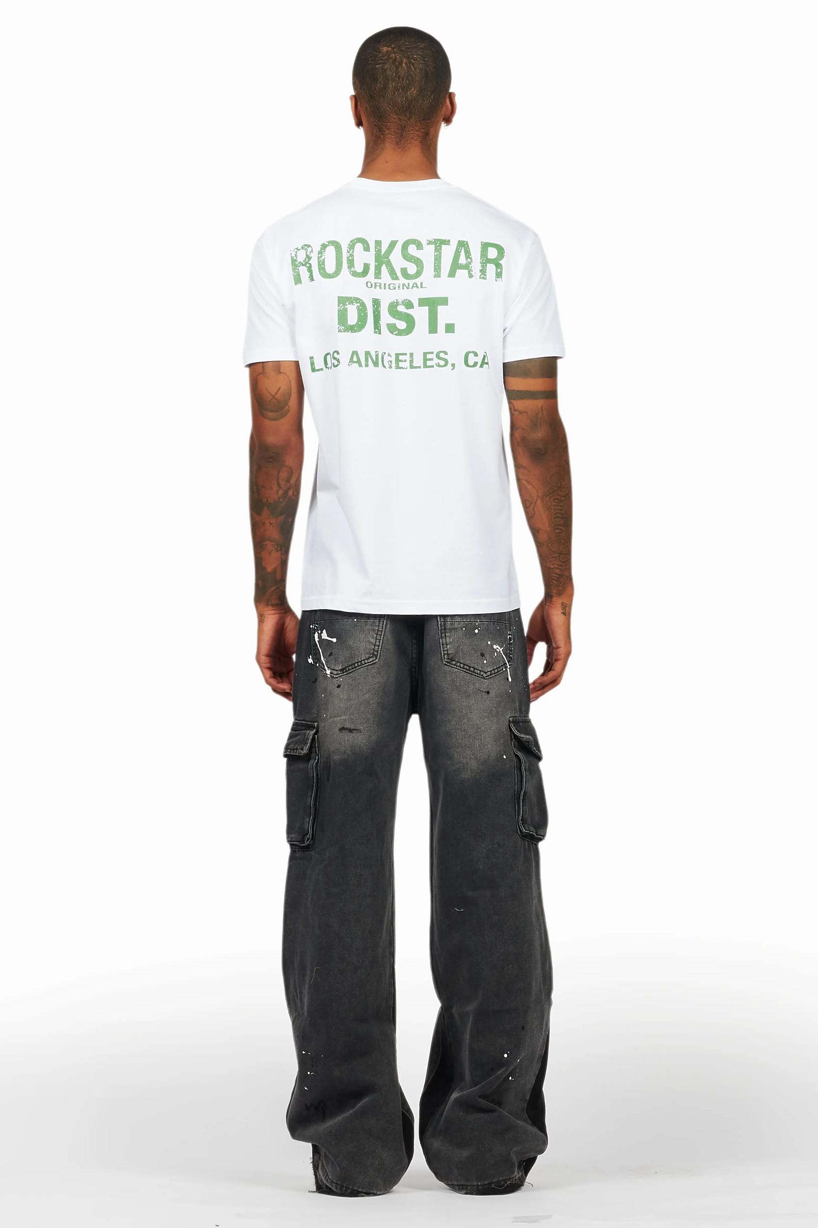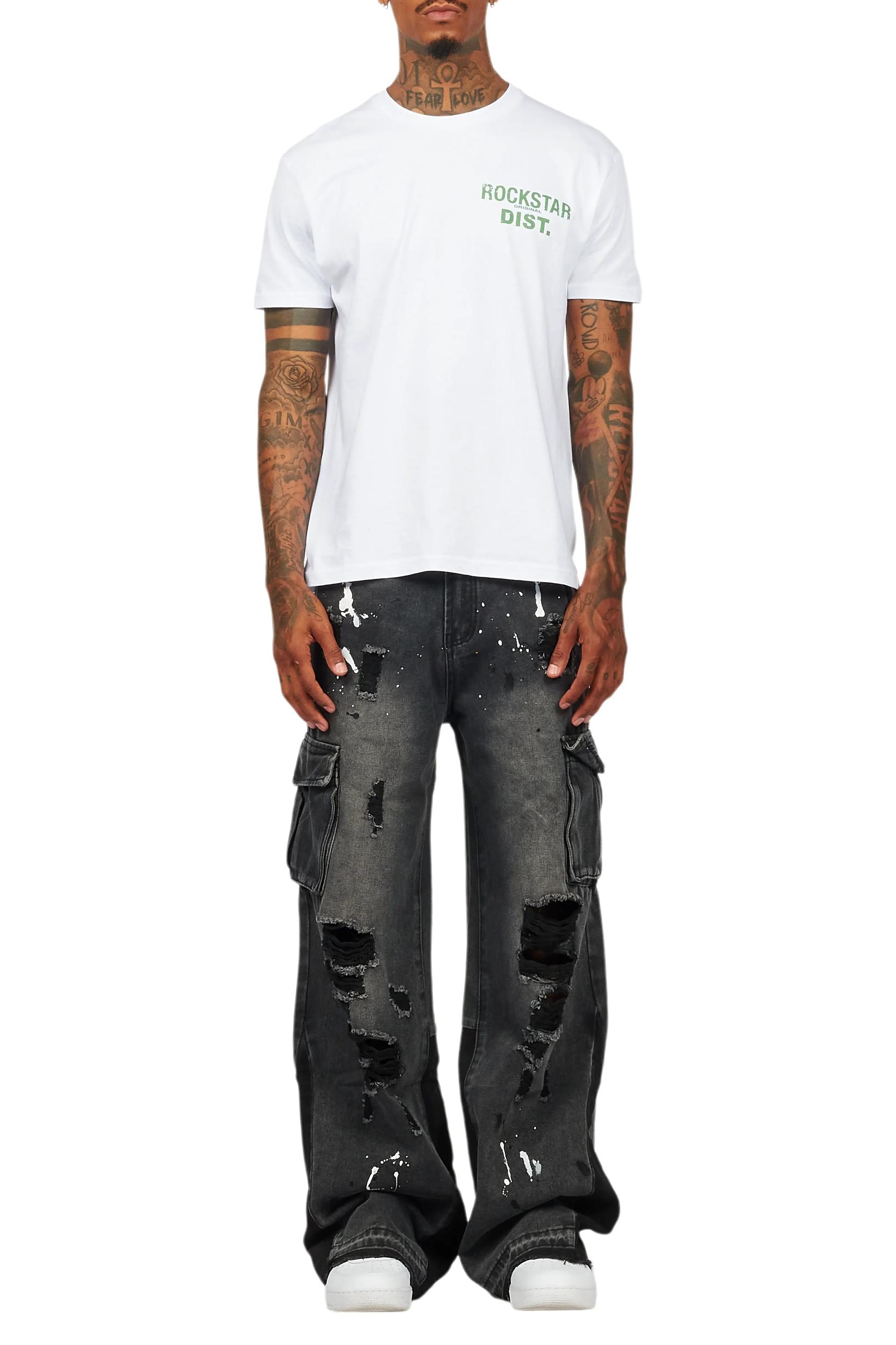 An urban cargo baggy jean for men in dark grey. Designed with organic cotton and utility pockets for a dope denim streetwear style. Zip fly with button closure 7-pocket build Utility pockets Distressed detailing Contrast seams Frayed hems Baggy denim construction Custom paint splatter