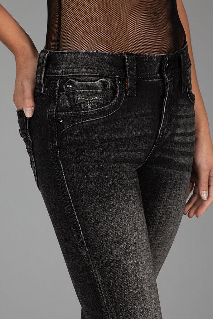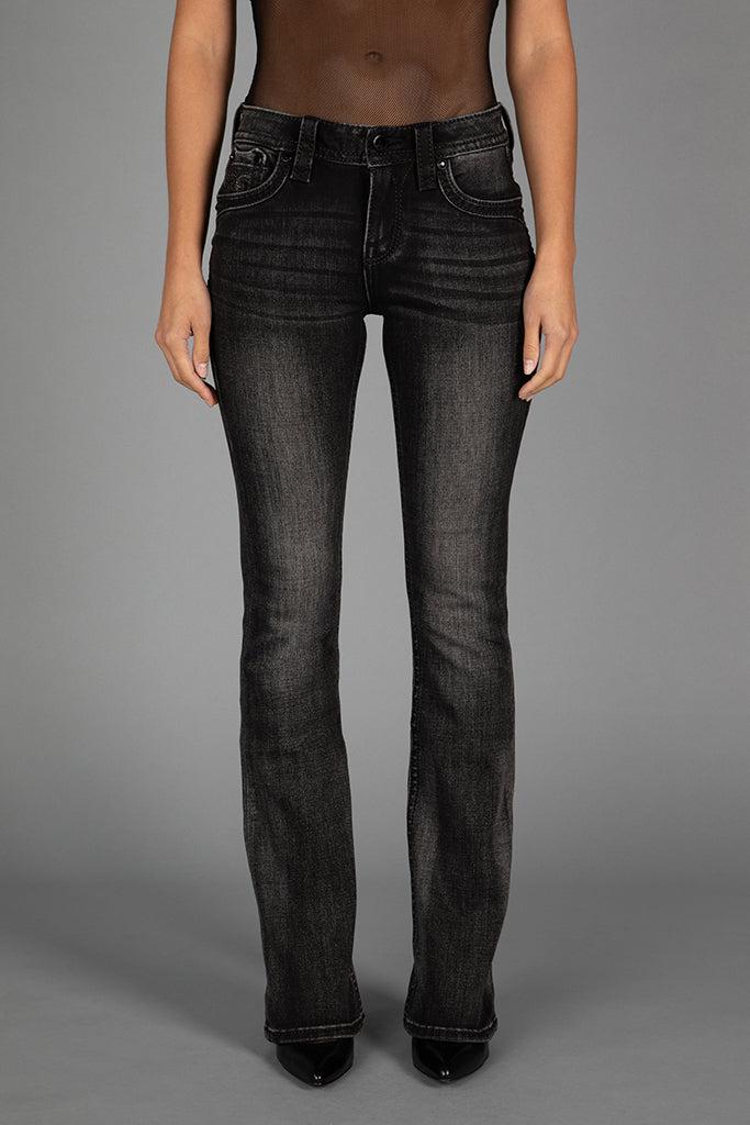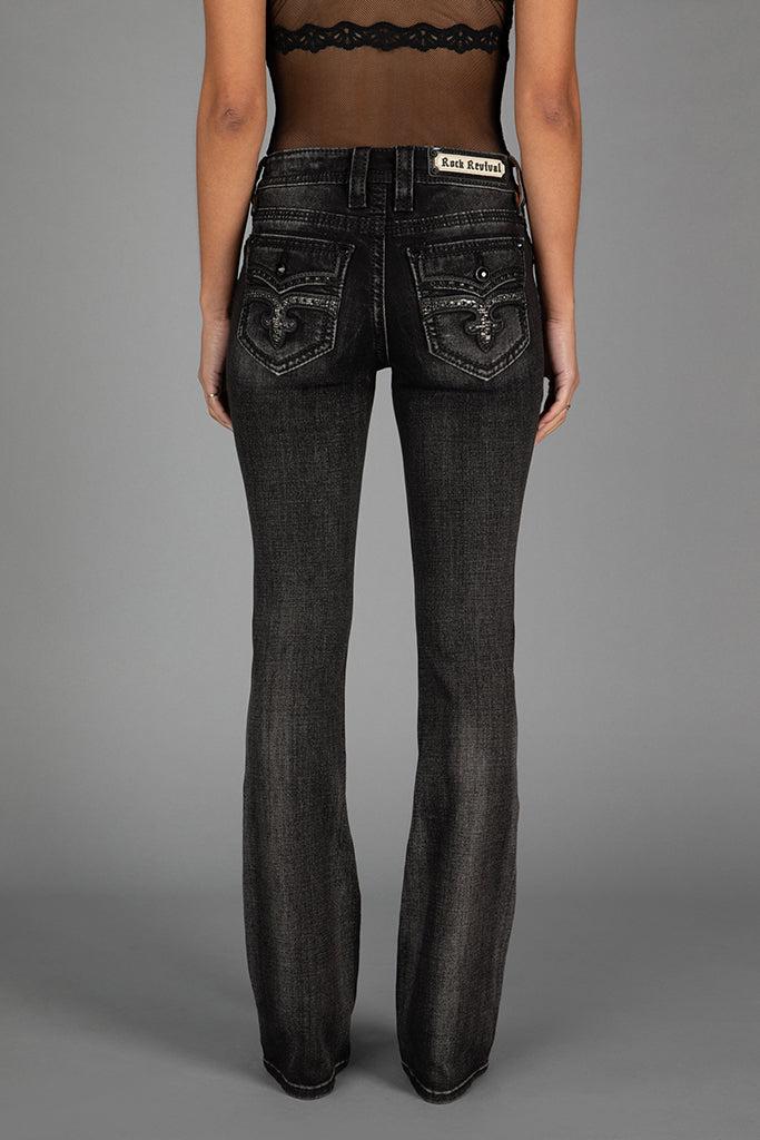 Dubarry Bootcut Jeans by Rock Revival features a mid rise with a bootcut silhouette crafted in a black wash, designed in Los Angeles.