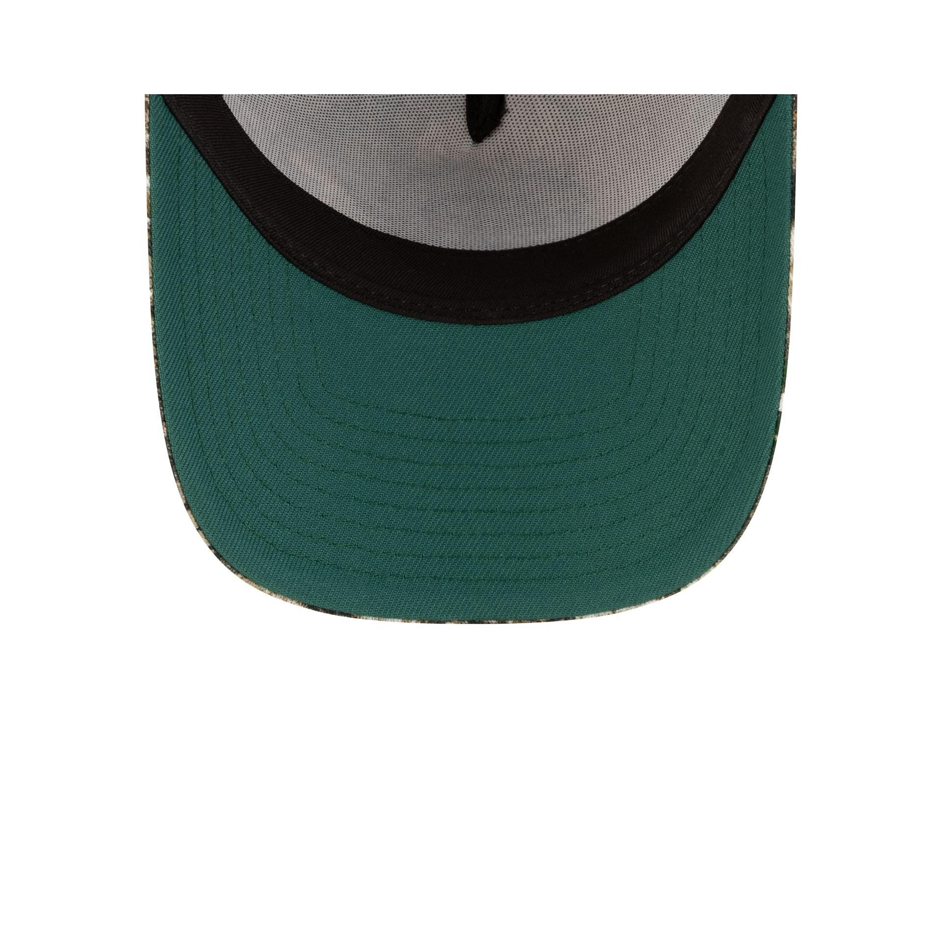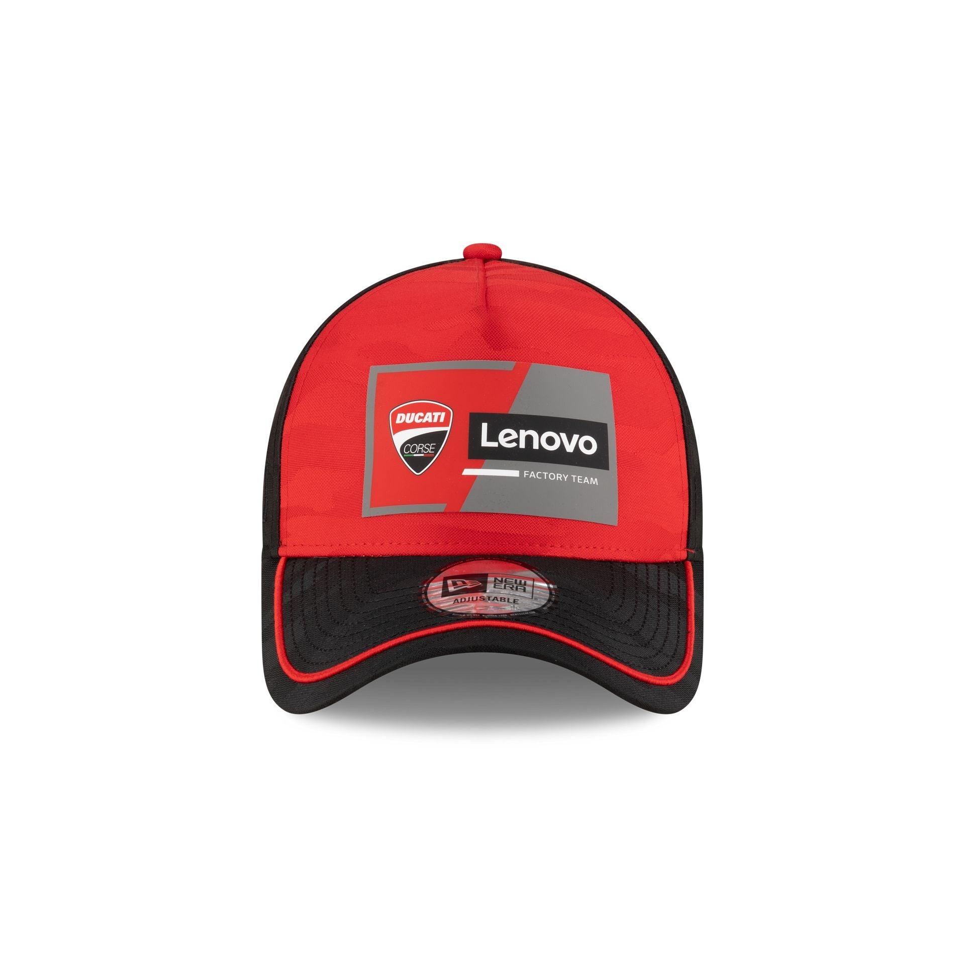 The Ducati Lenovo Team MotoGP Teamline 9FORTY A-Frame Adjustable Cap features a silicone Ducati patch at the front panel with a red and black tonal camo print fabrication. Additional details include sponsor logos throughout the cap with a tam logo at a black undervisor and an adjustable strapback closure at the rear.
