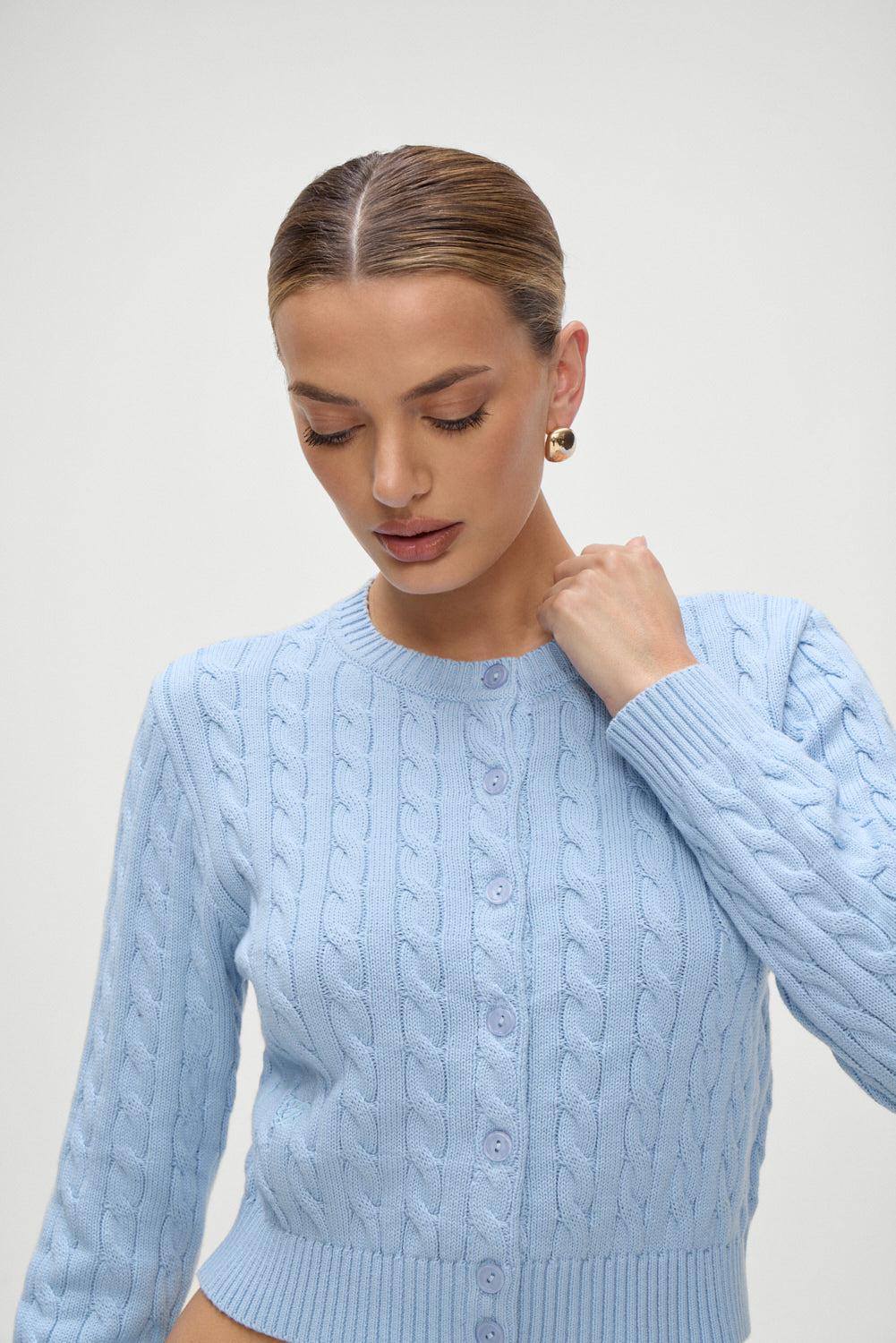This soft cotton knit cardigan captures the essence of sleepy autumn weekends. As the crisp fall breeze sweeps through the city, the Dudley cardigan sweater becomes your perfect companion. Details Cable knit design Snug feel with a slightly cropped fit Features our embroidered 'FB' logo Crafted with custom Frankies Bikinis buttons Fabric 100% Cotton Model Size & Fit This style runs true to size Bregje is wearing a size Small Height 5’9” (176m) Bust 33” (84cm), Waist 26" (66cm), Hips 37" (94cm)