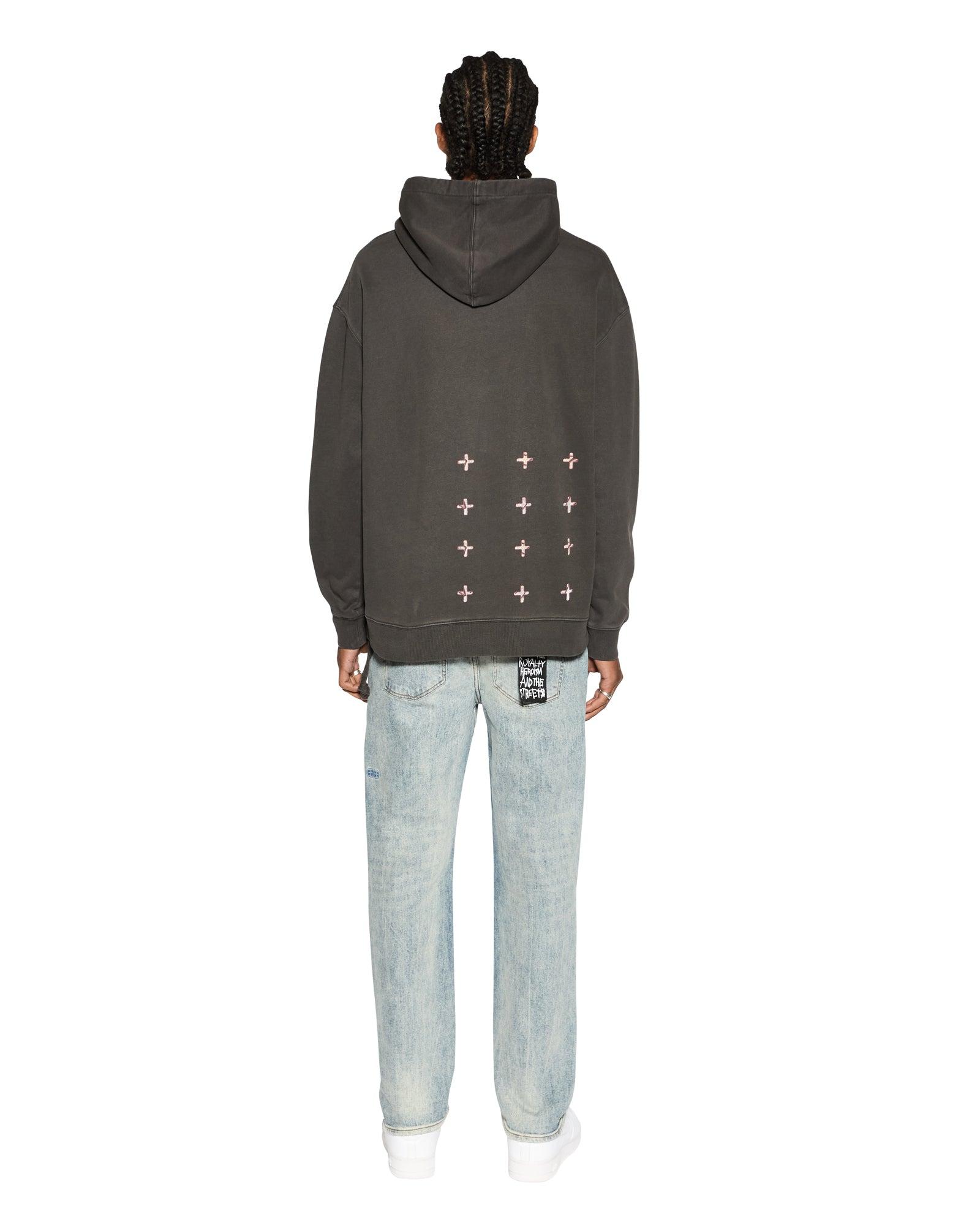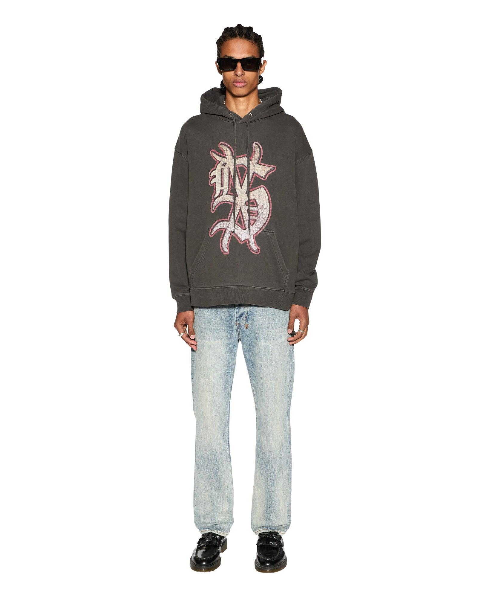 The Dug Out Biggie Hoodie Faded Black is an oversized hoodie with drawstrings, metal hardware, and a signature rats tail, crafted from premium loopback fleece in overdyed faded black. It features original screen-printed artwork on the front and back, and is finished with t-box branding.