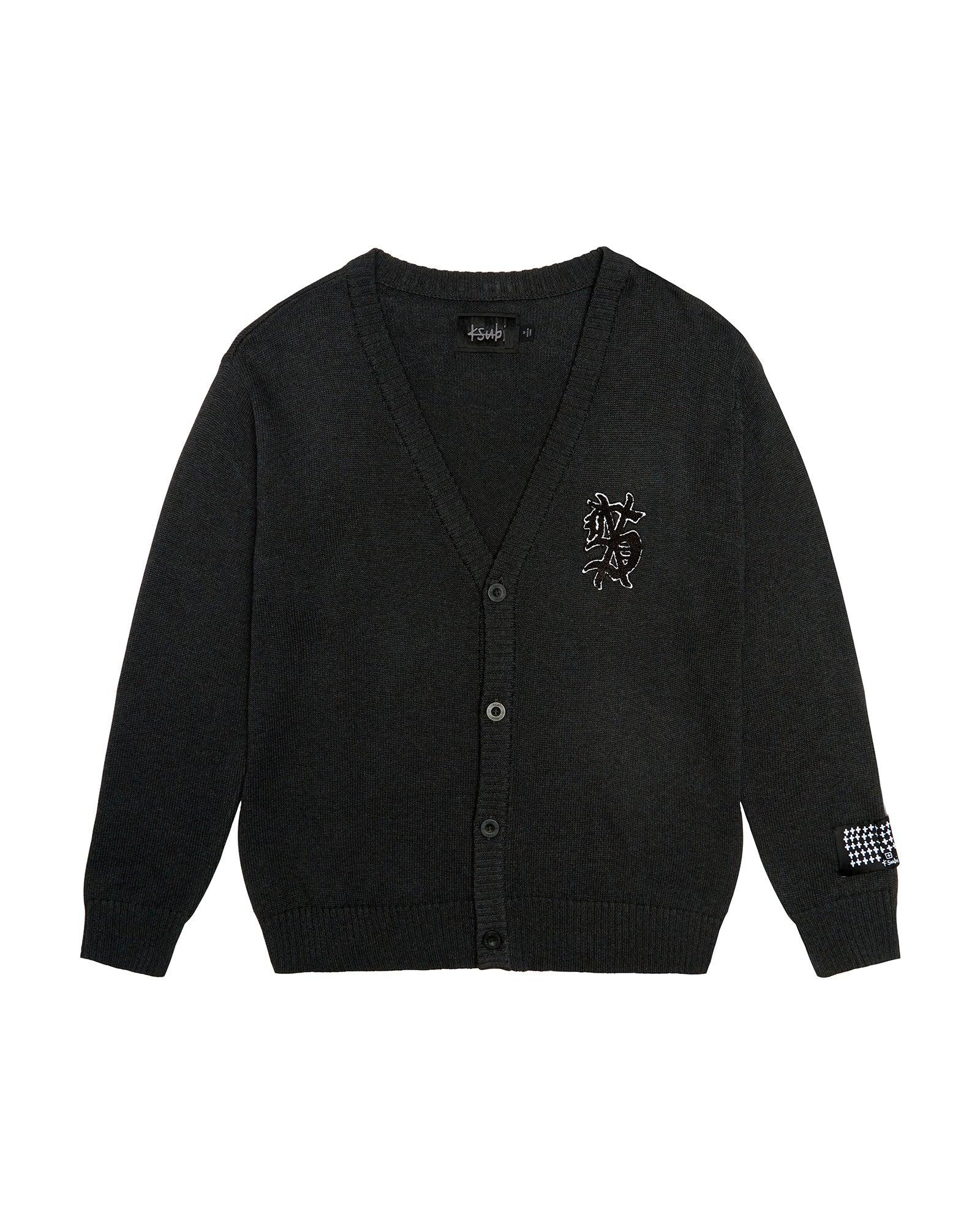 The Dug Out Cardigan Black is a relaxed fit knit cardigan featuring a 4-button closure and ribbed hem. Made from black cotton with an aged wash, it includes a cross dollar boucle embroidered patch at the chest and is finished with a Ksubi sleeve tag, T-box embroidered branding, and Ksubi branded hardware.