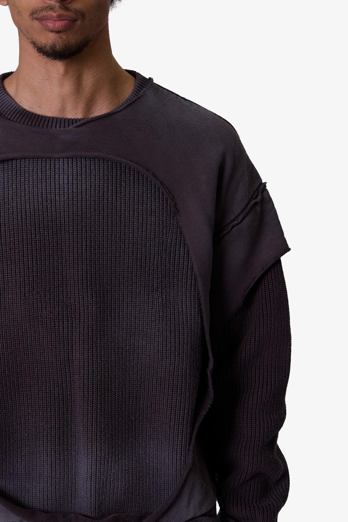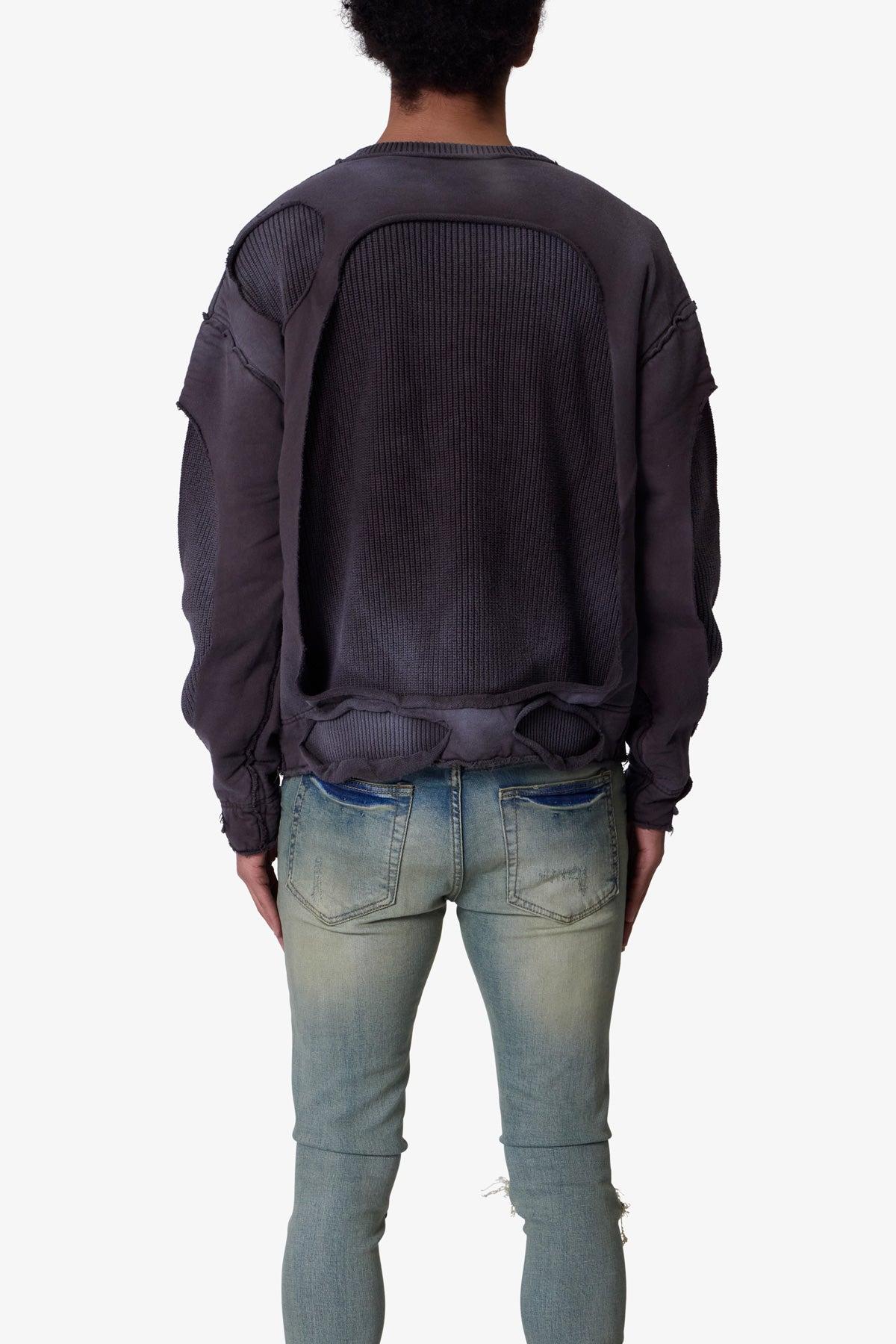 the Dug Up Distressed Sweater is a custom-knit sweater that is constructed from cotton yarn, with a french terry layer over the base with distressing details exposing the sweater underneath with a ribbed collar and features runs and finish with a spray wash throughout. details standard fit 100% cotton model is 6’1, 140