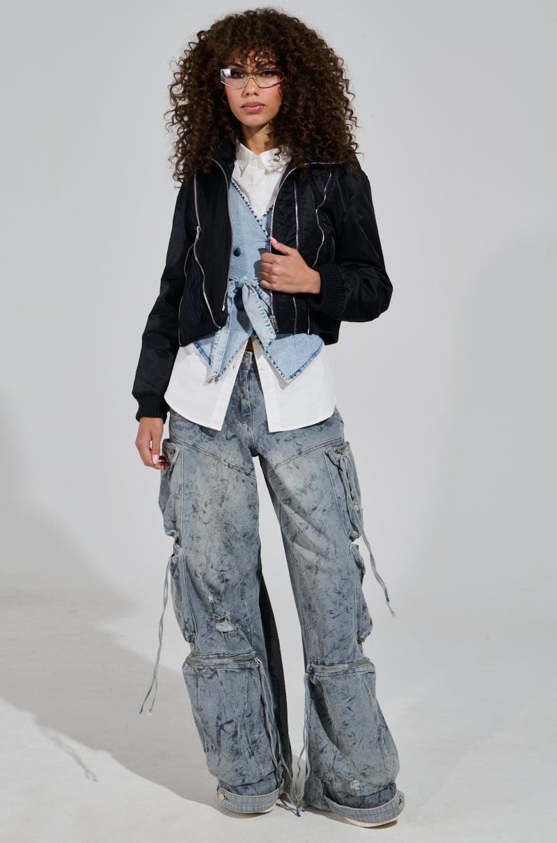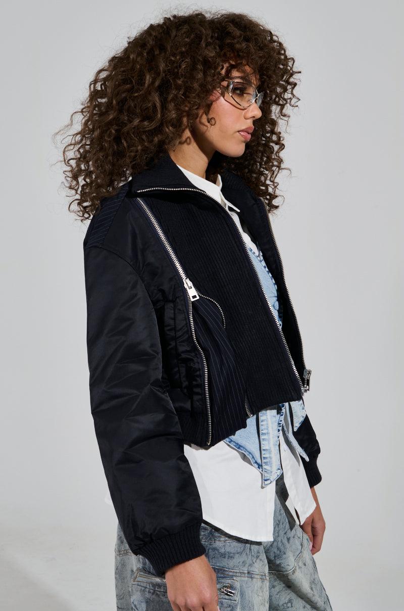 Stay chic all winter long in The AKIRA Label Duke Zipper Detail Bomber. This contemporary outerwear piece is crafted from a sleek knit base and features a ribbed knit mock collar with a coordinating ribbed knit panel running down one side of the front bodice, a paneled construction, long sleeves with ribbed cinched cuffs, a coordinating cinched waistband, and non-functional metallic zipper accents with one functional zipper that exposes a pinstripe pattern interior, and side slant front pockets. Complete with a traditional pinstripe pattern throughout the back, a front zipper closure, and a boxy, cropped fit. Pair with cargo pants and loafers for an effortlessly cool ensemble. - Shell 1: 100% Polyester, Shell 2: 69% Polyester 29% Cotton 2% Spandex, Rib: 90% Acrylic 10% Spandex, Lining: 100% Polyester- Some Stretch- Imported (all measurements approximate from size small)- 16” Shoulder to Hem- 22” Sleeves- 19” Shoulder to ShoulderProduct ID: 433977 (all measurements approximate from size 1X)- 18” Shoulder to Hem- 23” Sleeves- 21” Shoulder to ShoulderProduct ID: 433981