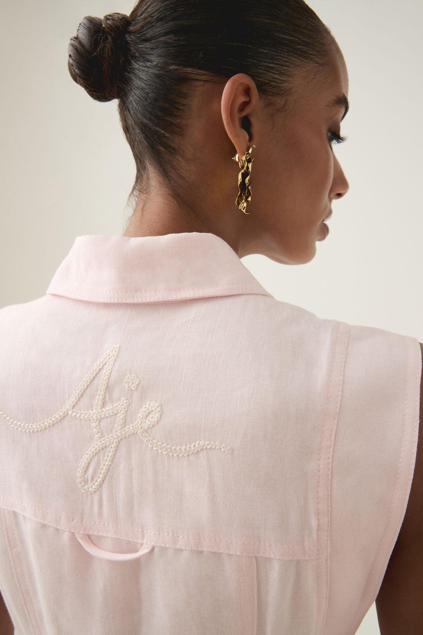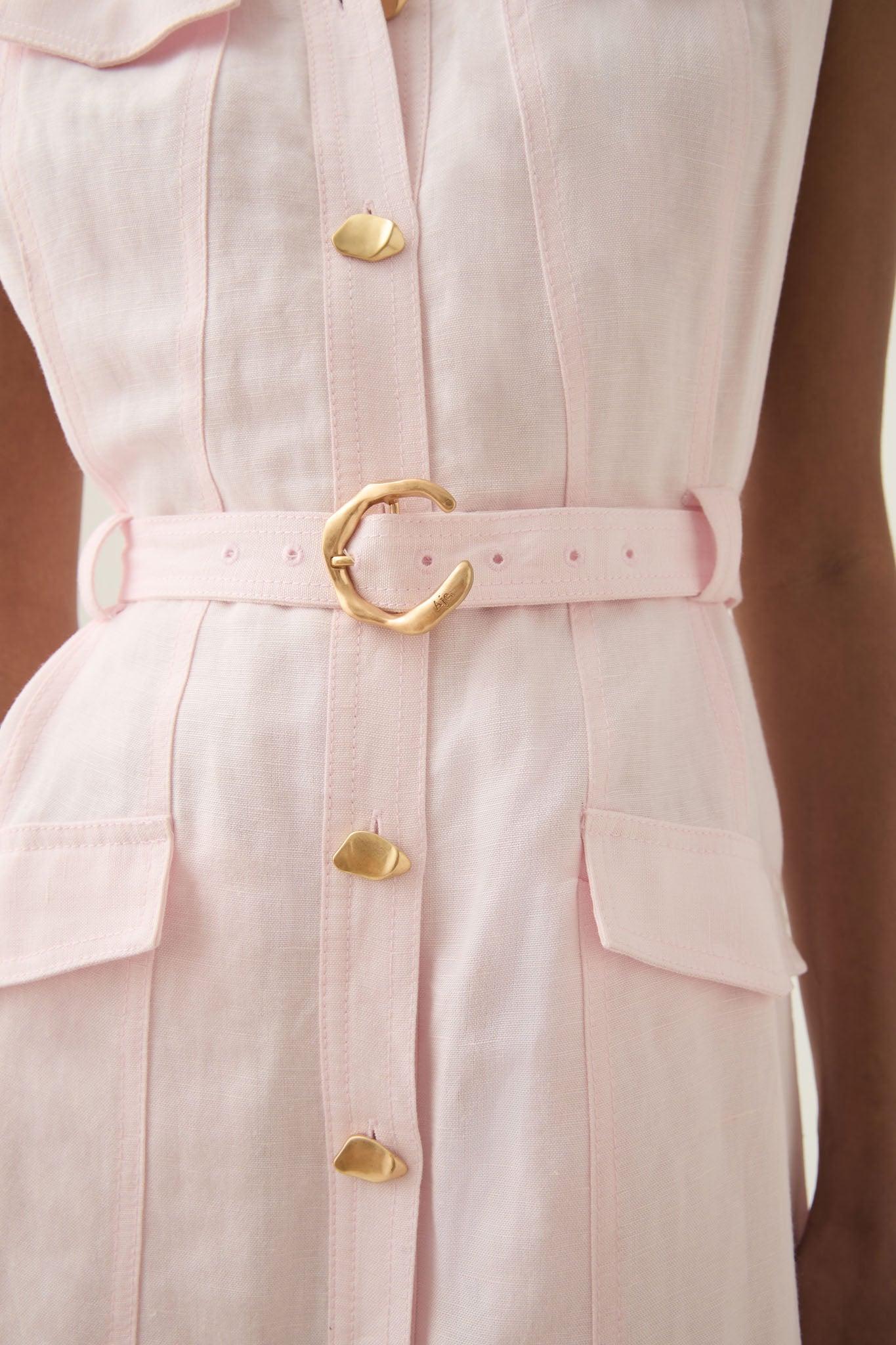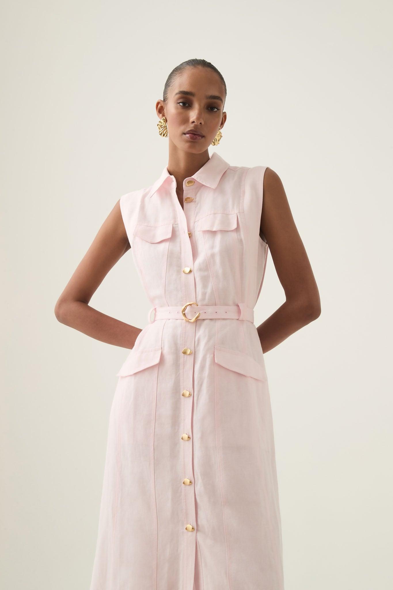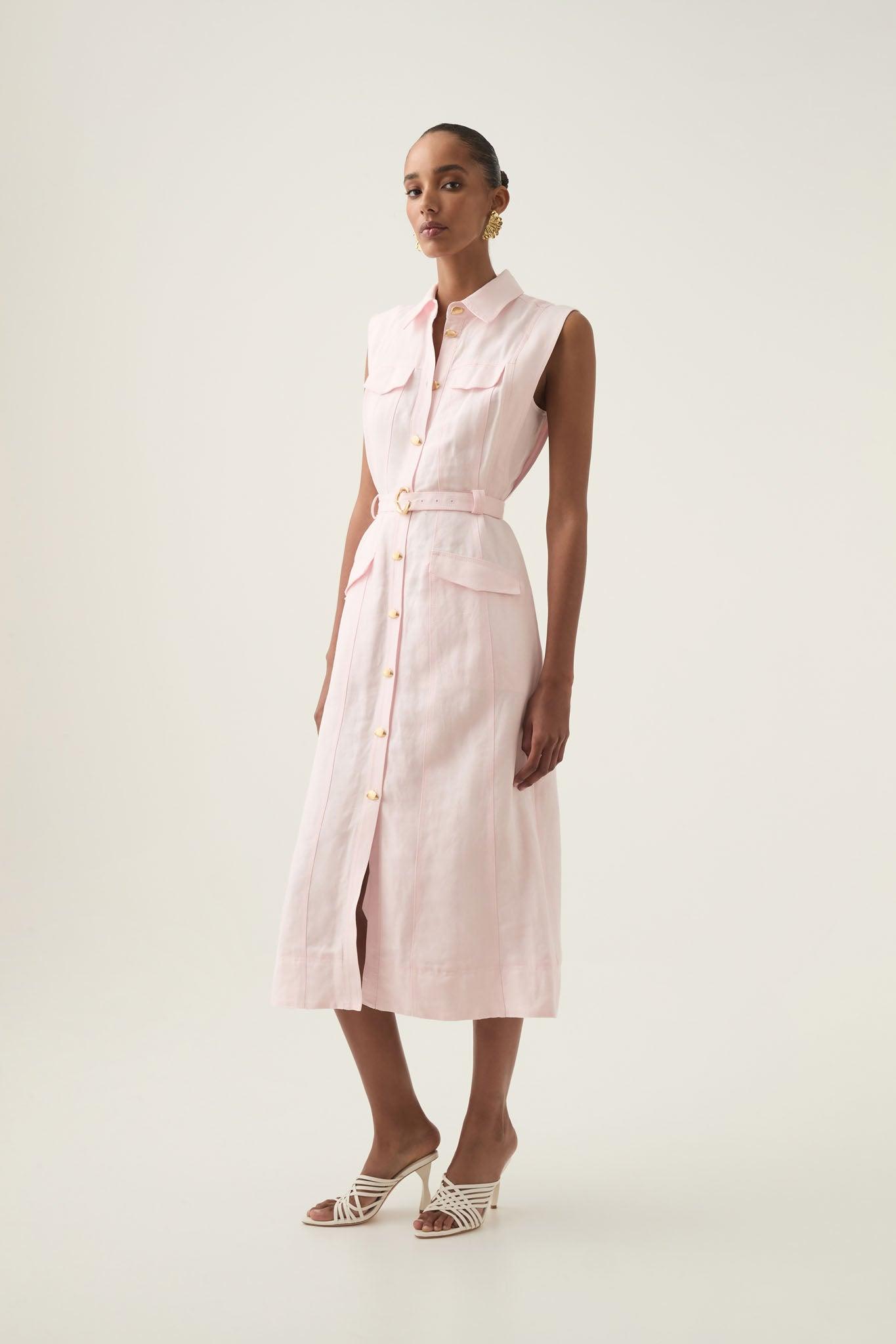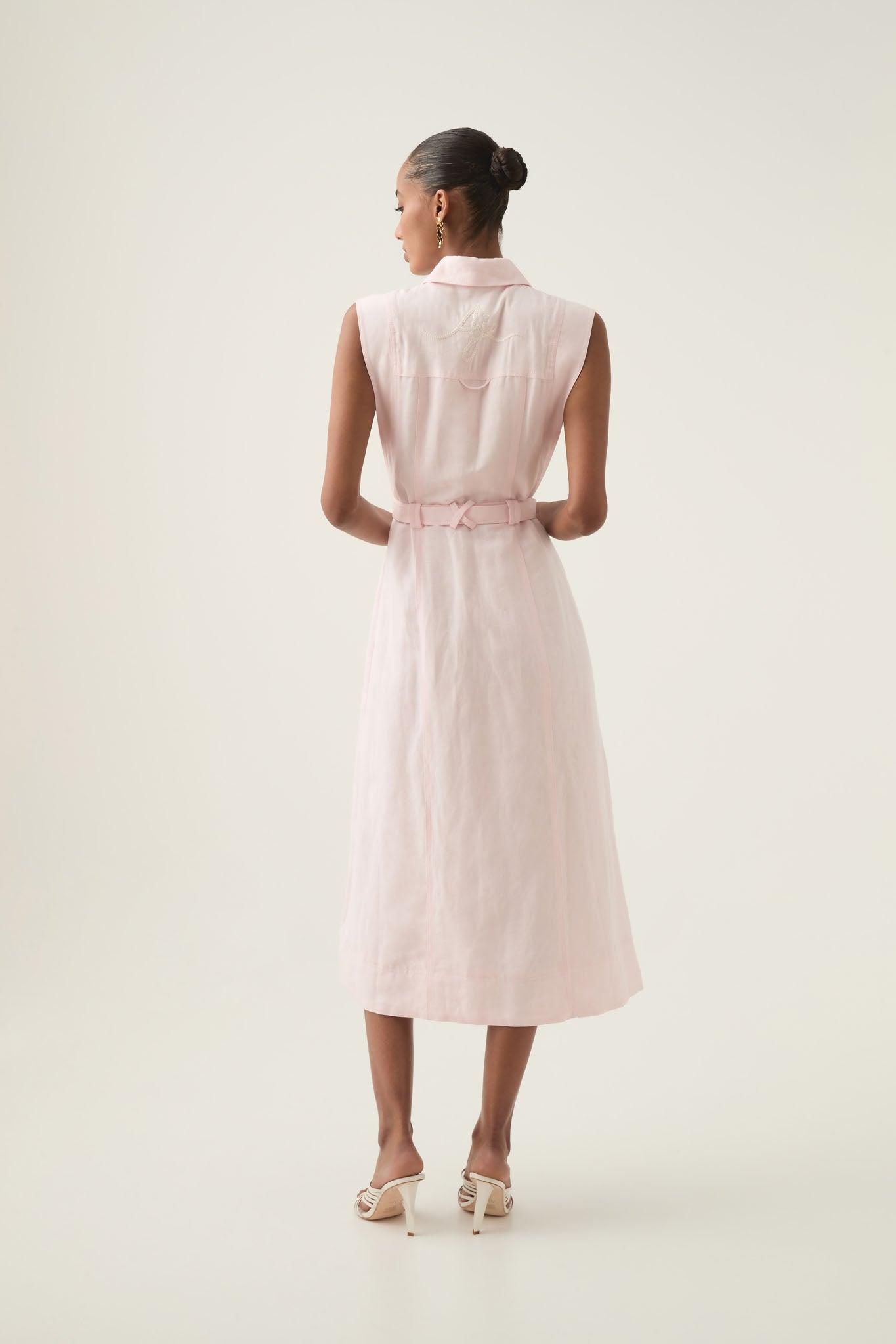 PRODUCT DETAILS Women's midi dress Collar Front button placket Faux chest pockets Removable belt with metal buckle Back embroidered logo detail Lined 55% Linen, 45% Rayon Dry Clean Only P Shop All Dresses SIZE AND FIT Model wears a size AU 8/S Height: 175cm/ 5’9 Bust: 81cm Waist: 60cm Hips: 89cm