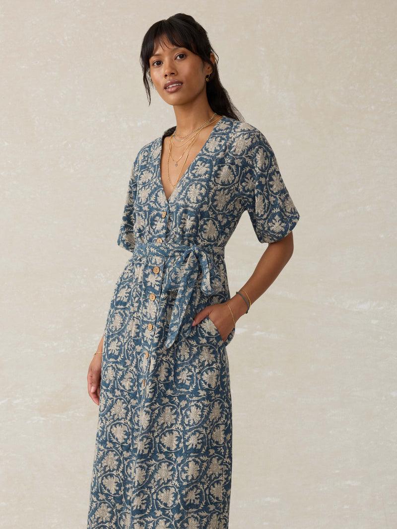 Detail: Button through dress with coco buttons. Patch pockets at front. Removable self belt.