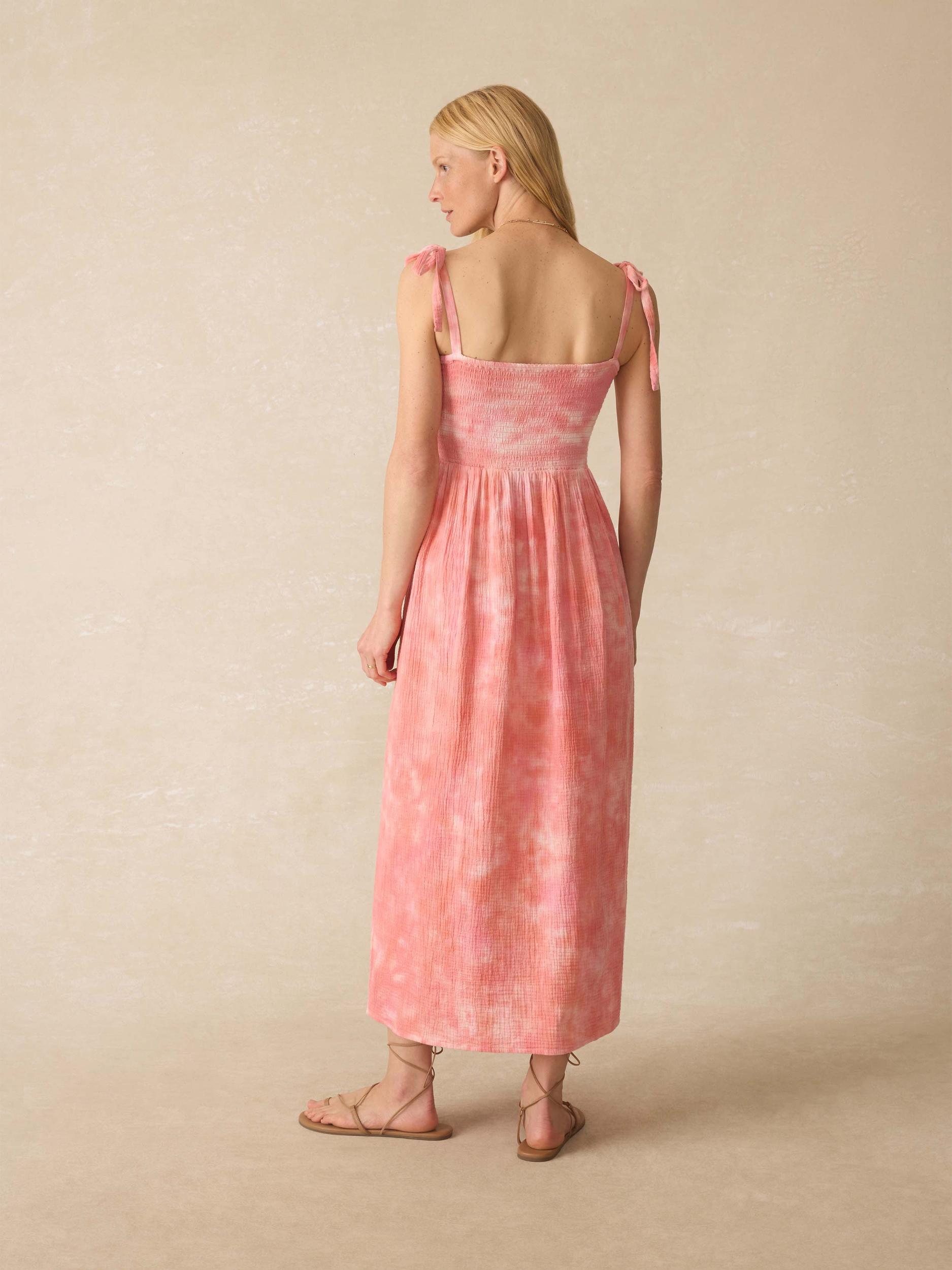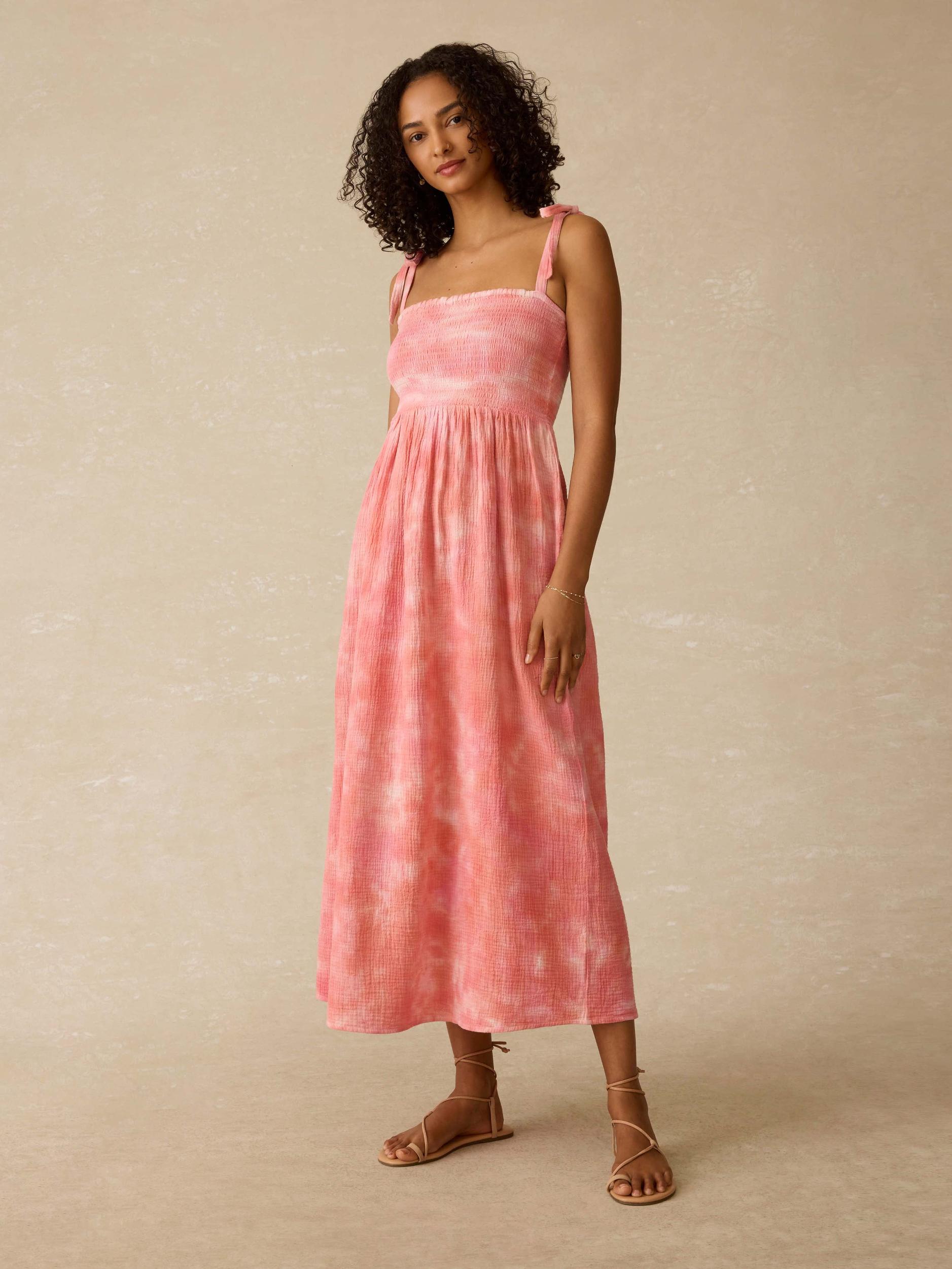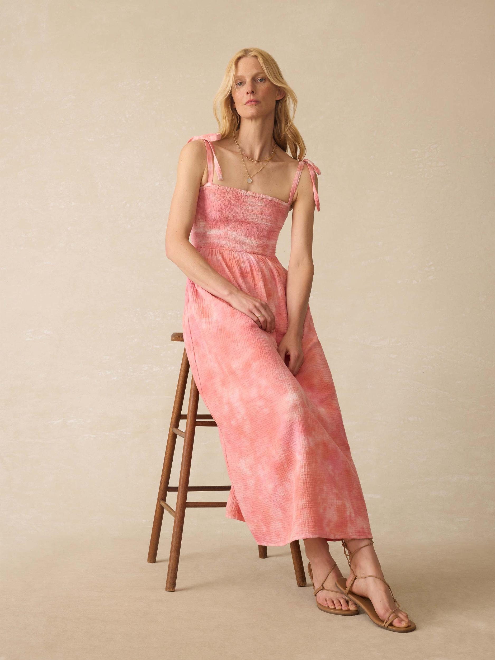 Washed in sun-faded tones, this maxi dress brings an easygoing charm to summer days. The smocked bodice offers a comfy, flexible fit, and the gauze cotton flows with every step—light, breathable, and ready for whatever the day brings. Fit: Classic Fit, Length 53" Detail: Smocked bodice with encased elastic at top edge. Functional ties at straps. Material: 100% Organic Cotton Model: Angelica is 5'10 wearing size Small Care: Turn inside out. Machine wash cold separately. Delicate cycle. Do not bleach. Tumble dry low. Remove promptly. Cool iron when needed. WDU2578-RIL