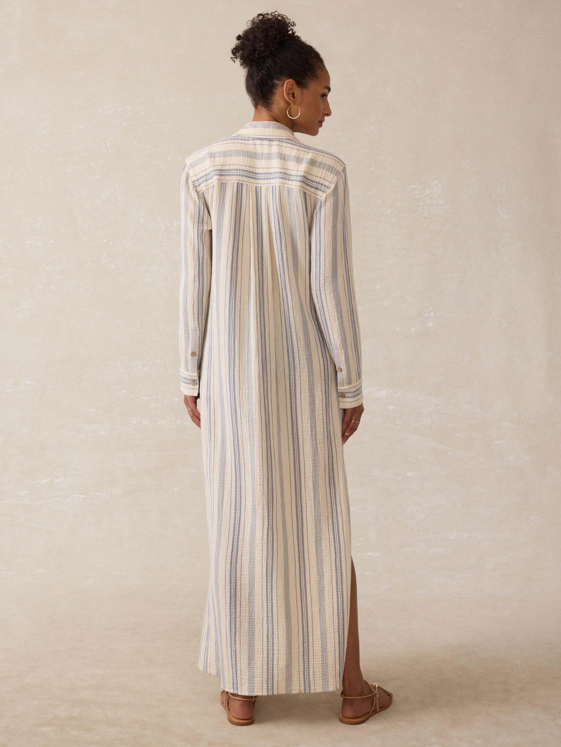 Easy and elegant, this maxi-length shirtdress is your warm-weather wardrobe hero. Made from lightweight cotton gauze that feels like a dream against the skin, it features a classic button-front silhouette with a relaxed fit and just the right amount of drape. Dress it up with espadrilles and statement earrings, or keep it casual with slides and a sun hat. Fit: Relaxed Fit, Length 53" Detail: Button front dress with coco buttons. Side slits. Material: 100% Organic Cotton Model: Angelica is 5'10 wearing size Small Care: Close all fastening before wash. Turn inside out. Machine wash cold with like colors. Delicate cycle. Do not bleach. Tumble dry low. Remove promptly. Cool iron when needed. WDU2554-AQE