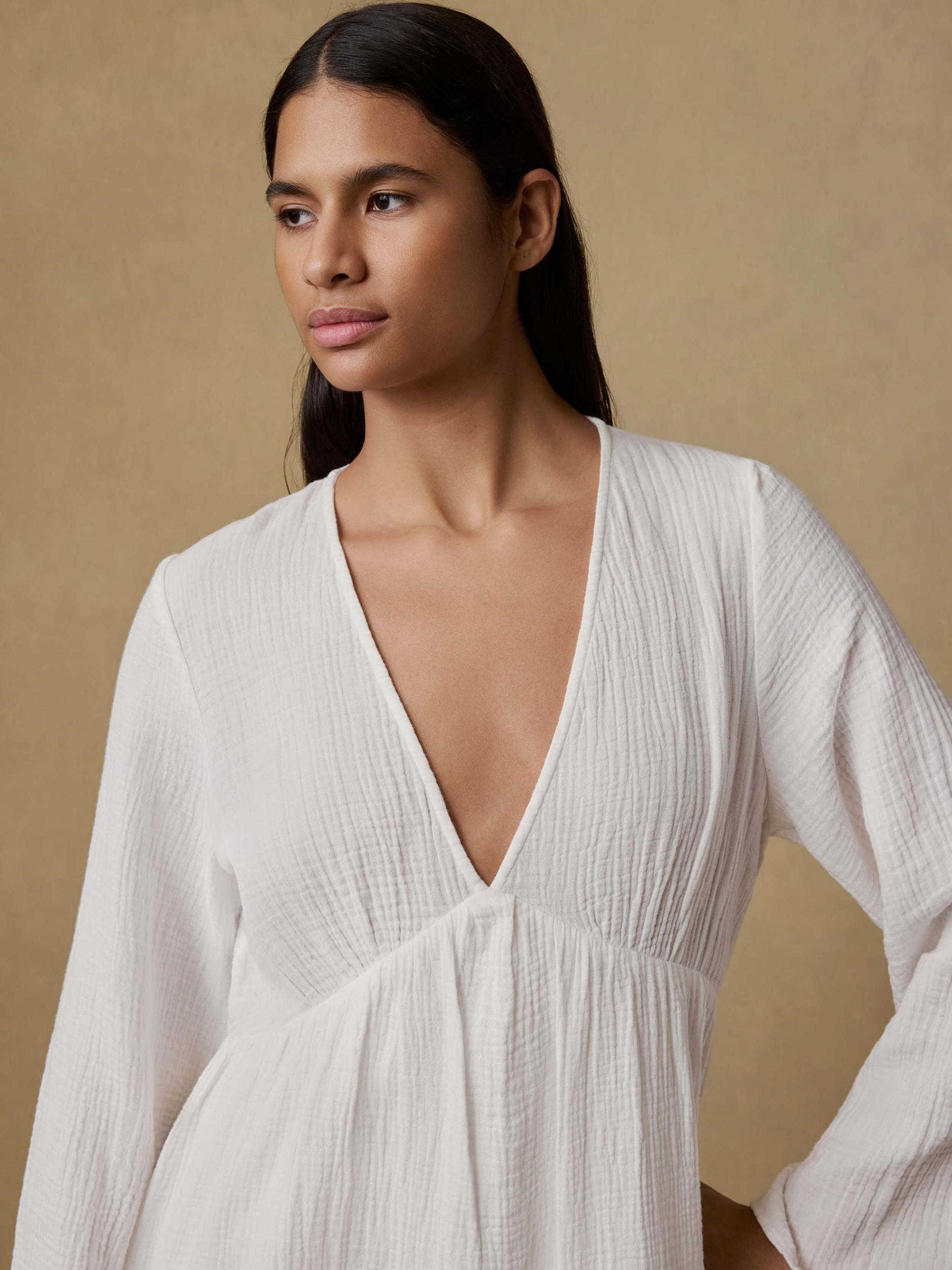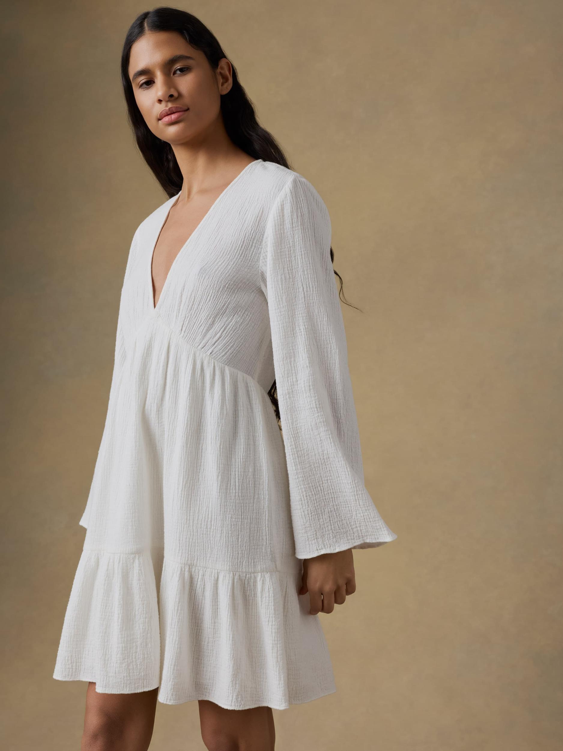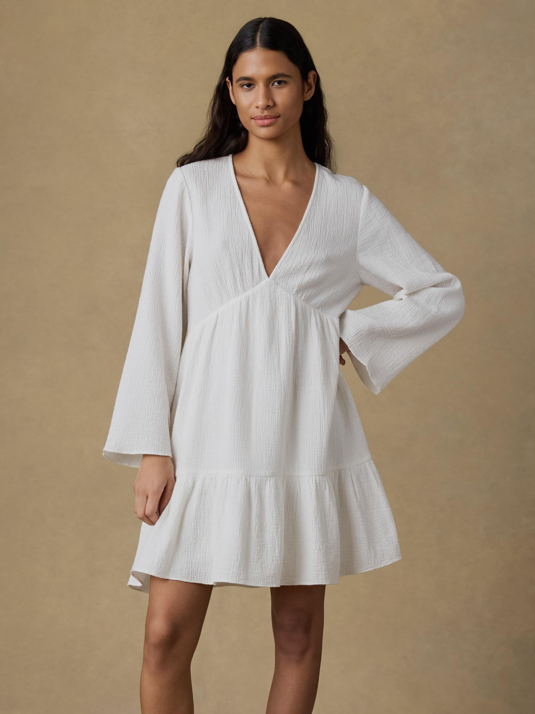 This flowy mini dress is crafted from soft gauze cotton that feels like a warm breeze. Shirring at the bodice adds texture, while a tiered skirt and billowy sleeves bring all the effortless movement. Lightweight, breathable, and sun-kissed ready—it’s the kind of piece you’ll reach for all season long. Fit: Classic Fit, Length: 35½" Detail: Slight shirring at bust seam. Elastic at back waist. One skirt tier with slight shirring. Material: 100% Organic Cotton Model: Lauren is 5'10 wearing size Small Care: Turn inside out. Machine wash cold with like colors. Gentle cycle. Do not bleach. Tumble dry low. Remove promptly. Cool iron when needed. WDS2562-WHT