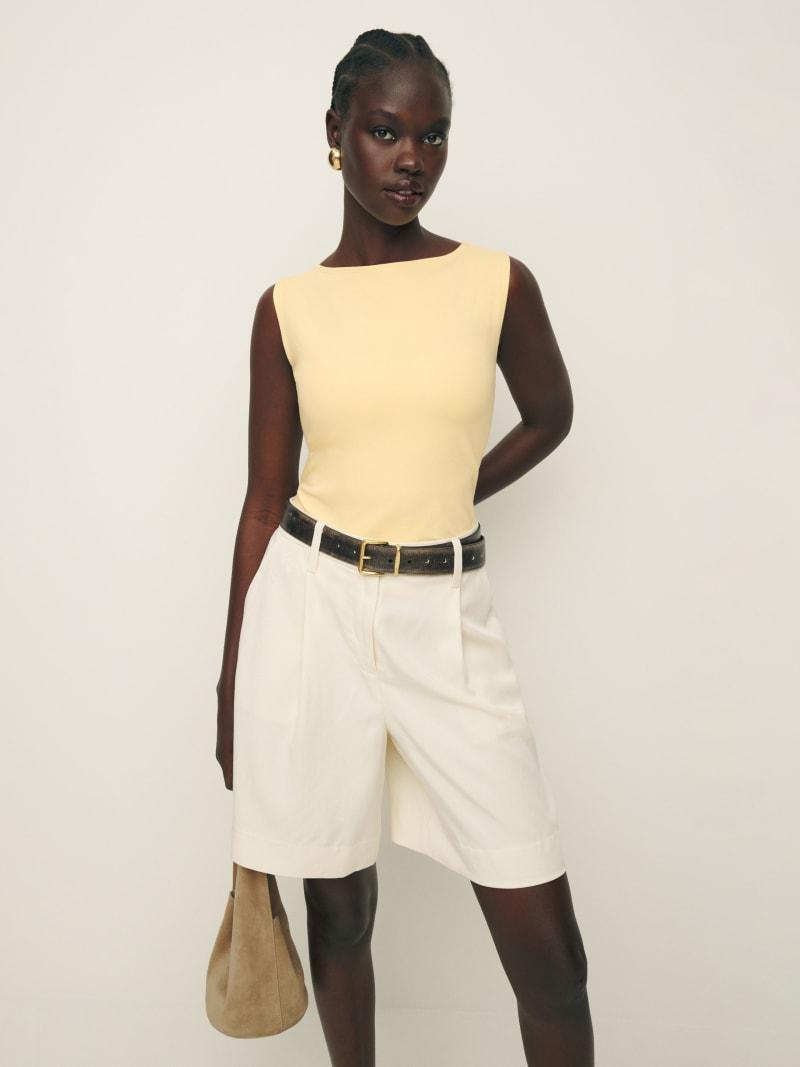 Bye sleeves. Shop the Dusk Knit Top from Reformation, a sleeveless, fitted top with a boat neckline.
