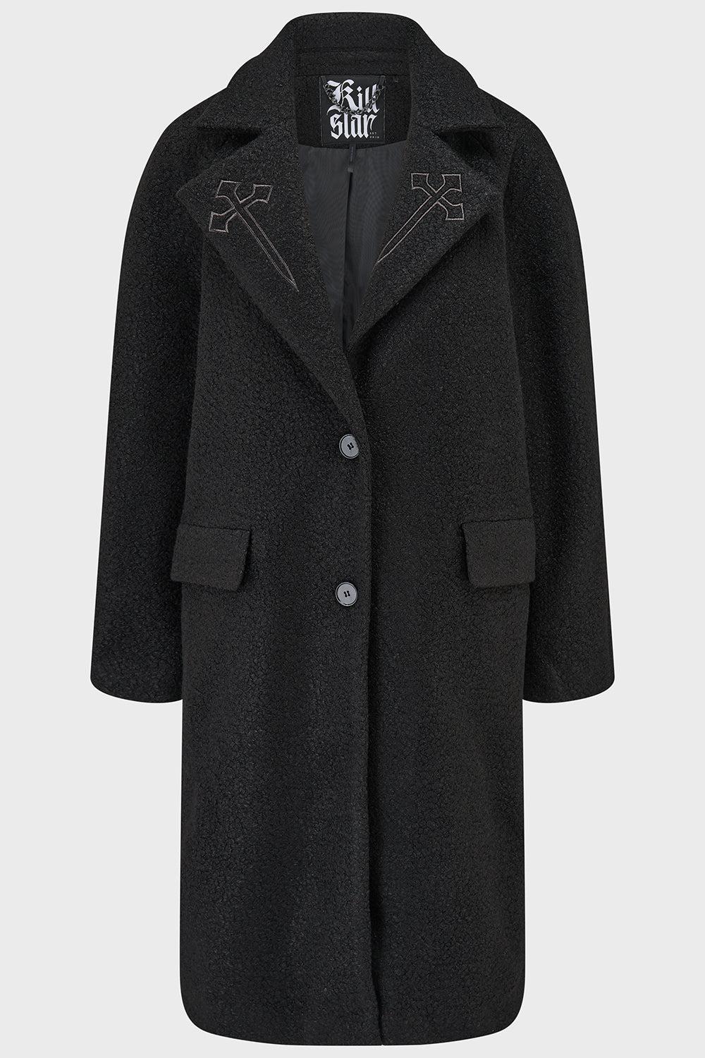 DUSKMOURN- High quality textured boucle fabric.- Long relaxed sleeves.- Fitted for layering.- Embroidered crucifix detail in lapel.- Single breasted two button closure.- Functional pocket with flap.- Fully lined.- Designed in Brighton, England.Model is 5'7 and wears a XS.With KILLSTAR branding, Fabric : 100% Polyester Lining : 100% Polyester.Machine wash cold (30°c) / Do not bleach / Do not tumble dry / Iron at low temperature / Do not dry clean. Imported.