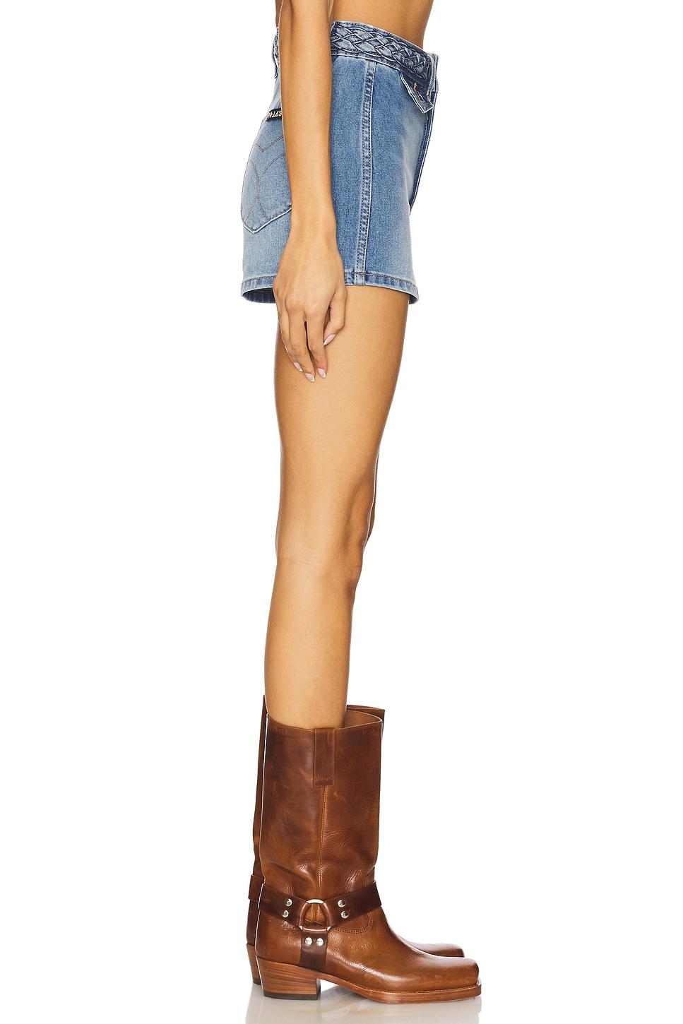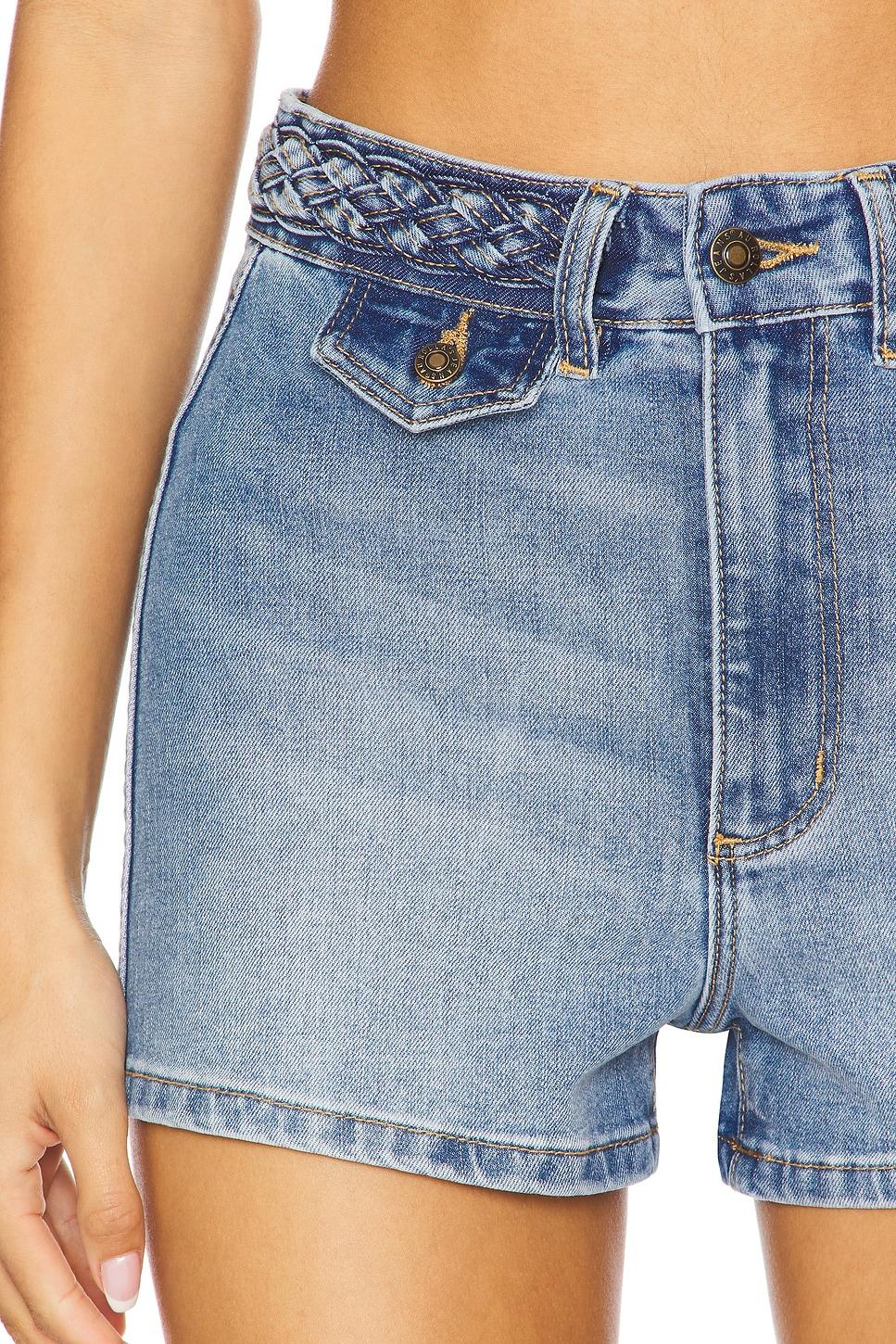 72% cotton, 27% polyester, 1% elastane. Made in China. Machine wash cold. Zip fly and button closure. Rigid denim fabric with braided waistband detail. 2 faux front flap pockets with buttons. Contrast logo patch at back pocket. Shorts measure approx 12" in length. Revolve Style No. ROLS-WF73. Manufacturer Style No. R51S17.