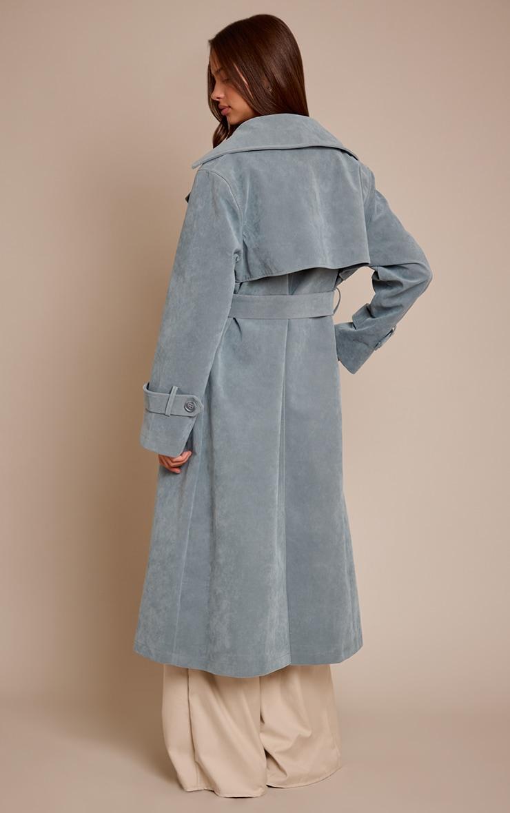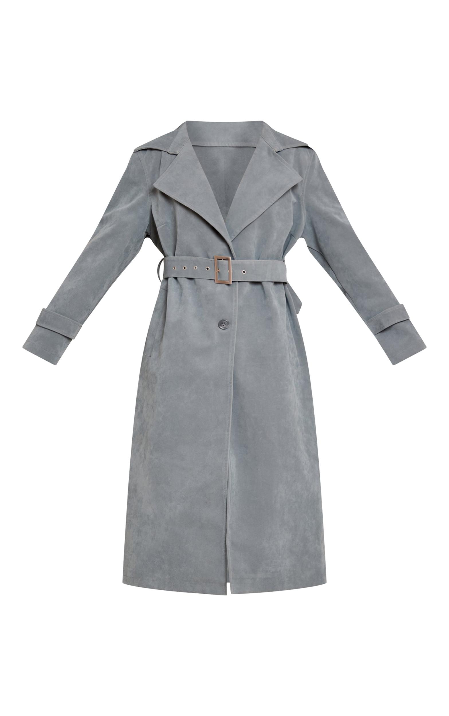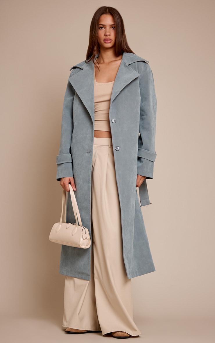 Layer up with undeniable confidence this season. The dusty blue faux suede belted trench coat redefines classic outerwear, its contemporary longline silhouette framed by wide notched lapels and a streamlined single-button fastening. A self-tie belt with a sharp rectangular buckle cinches the waist, creating an artful profile, while cuff straps add an intentional detail. Style this versatile coat over tailored wide-leg pants and a simple knit for an effortlessly polished day look. Ground your ensemble with sleek chunky boots for an assured stride, then complete the aesthetic with a sharp black shoulder bag, curating a look that speaks volumes without effort. It's the ultimate layer for those who lead with style.Length approx 124.5cm/49inch (Based on sample size US 4)Model wears size UK 8/ EU 36/ AUS 8/ US 4Model Height - 5ft 9inchp]:!mb-4inch>Brand: PrettyLittleThingCategory: OuterwearProduct type: TrenchColor: Dusty BlueMaterial: Faux SuedeOccasion: Day