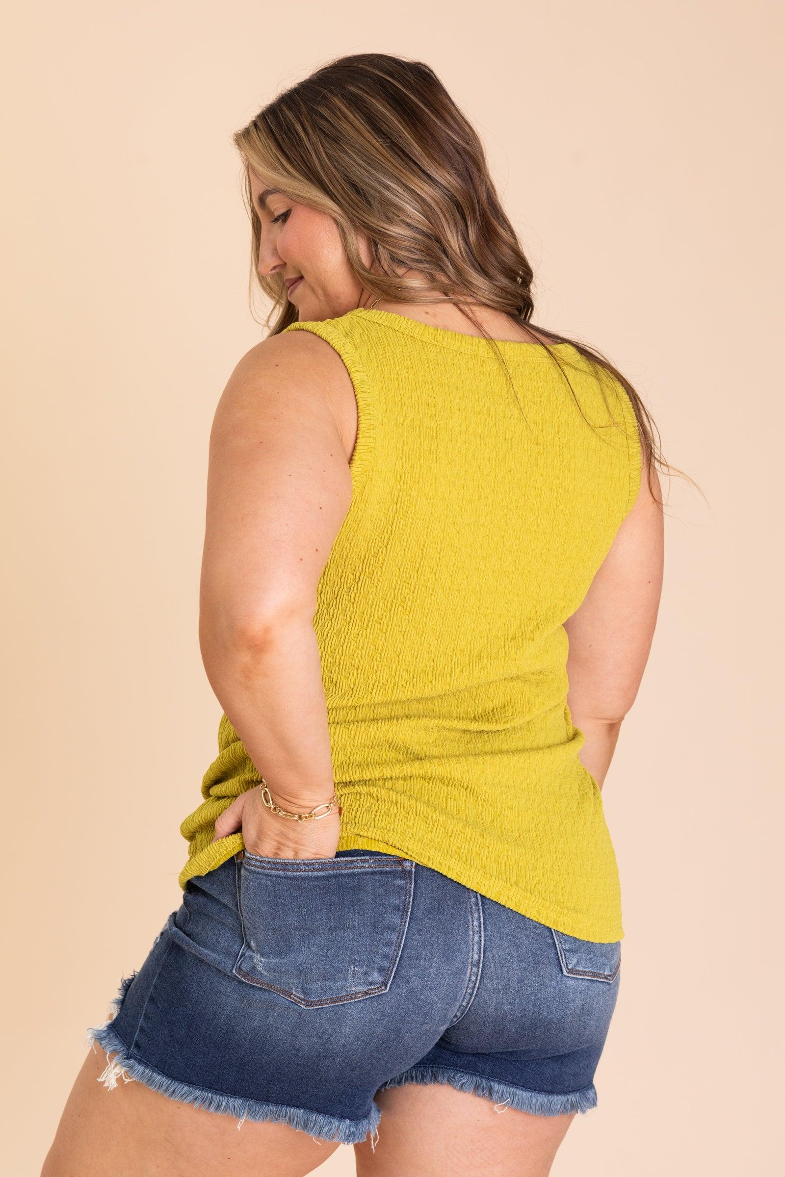 Product Details Colors: Dusty Lime Print: Textured Solid Neckline: Round Sleeve: Sleeveless Hemline: Round Brand: Heimish Material and Care 95% Polyester 5% Spandex Hand Wash Cold Hang/Line Dry Size and Fit Small: Bust 34" Waist 34" Length 27" Medium: Bust 36" Waist 36" Length 27.5" Large: Bust 38" Waist 38" Length 28" Model is 5'8 and is wearing her true size large