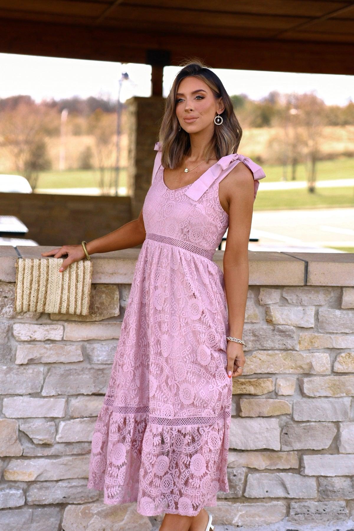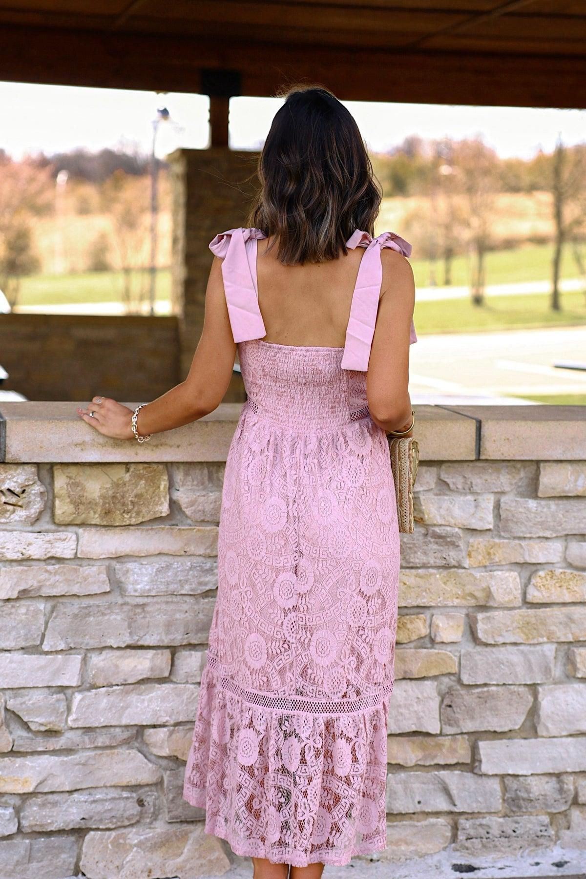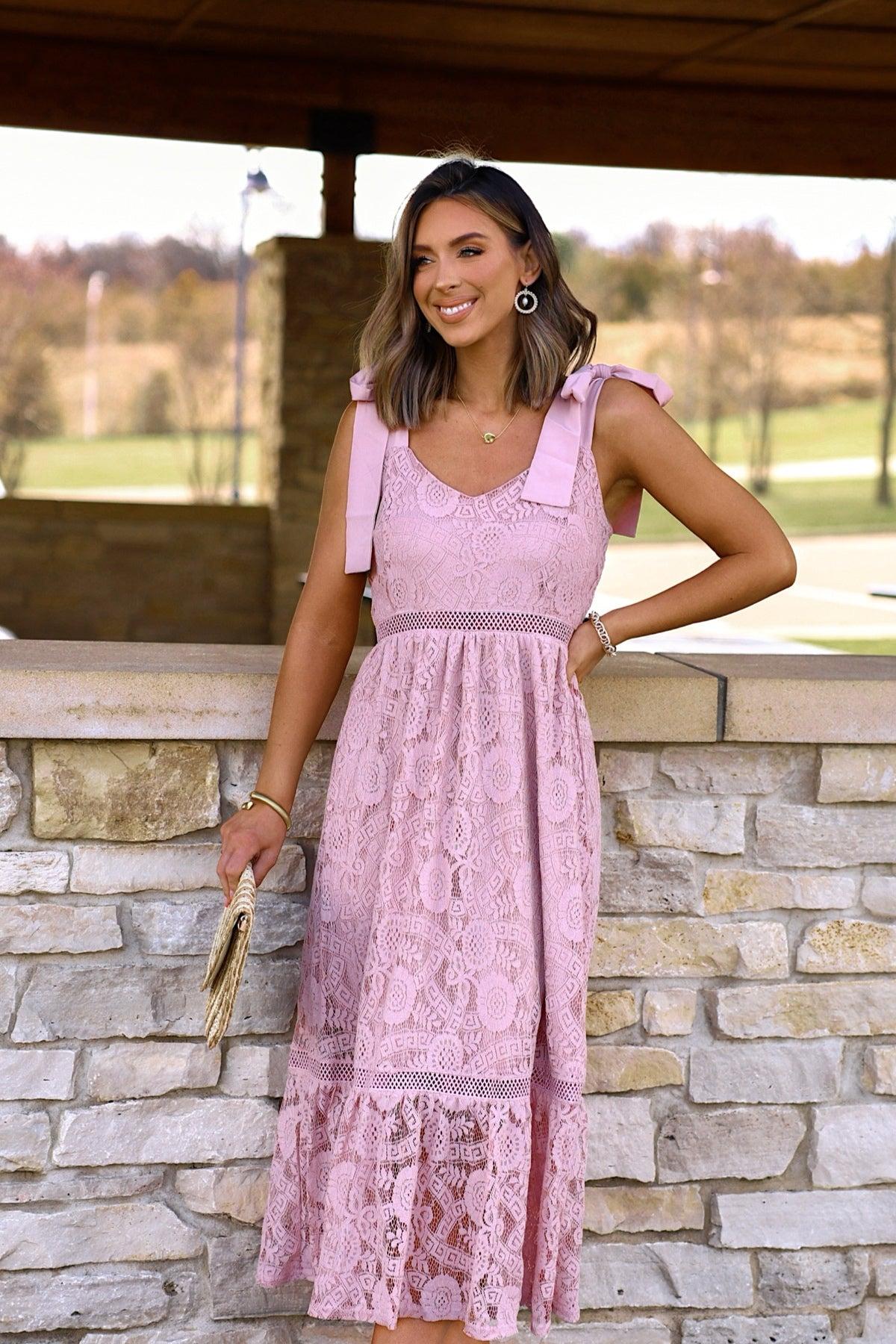 Soft, sweet, and effortlessly romantic—this dusty pink midi is made for moments that matter! Featuring self-tie straps and a flattering scoop neckline, this dress is beautifully detailed with sheer mesh lace trim that adds just the right touch of elegance. The lined silhouette offers coverage while keeping the look light and breathable. Whether you're headed to a bridal brunch, garden party, or Mother's Day celebration, this lace midi dress is a dreamy pick you'll reach for again and again.