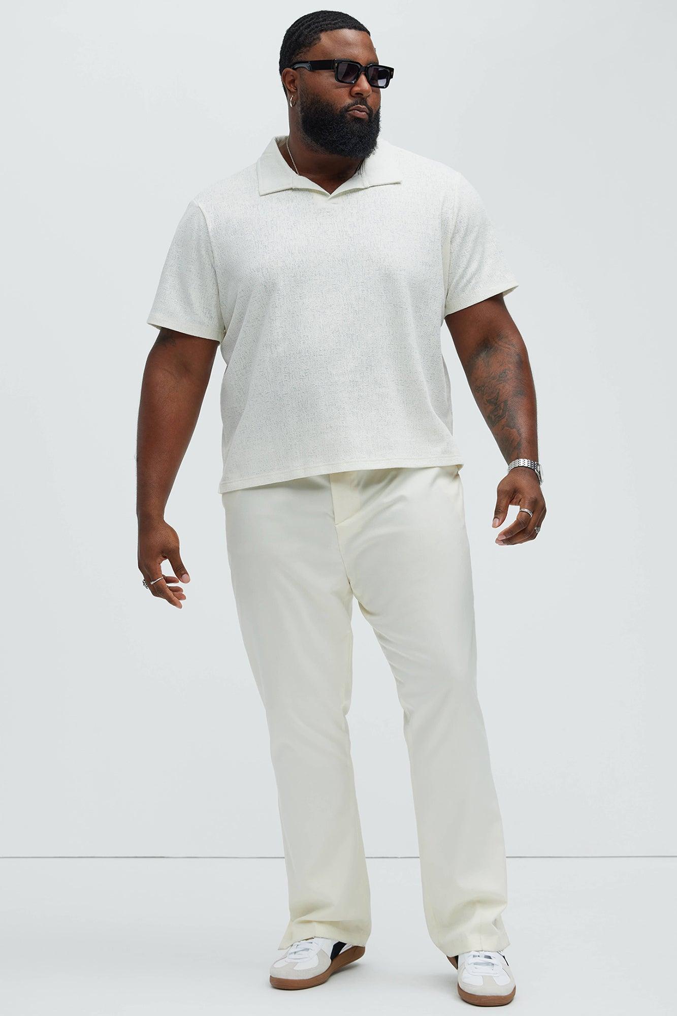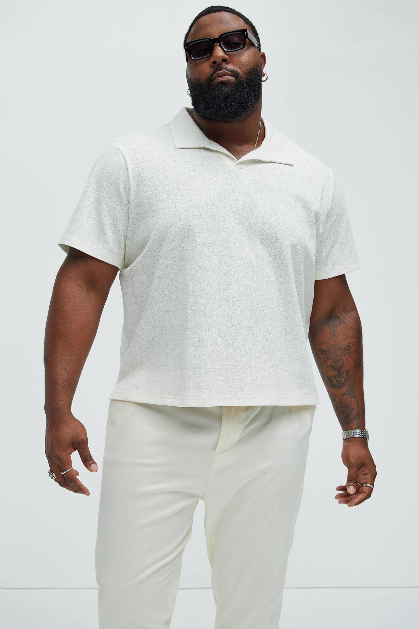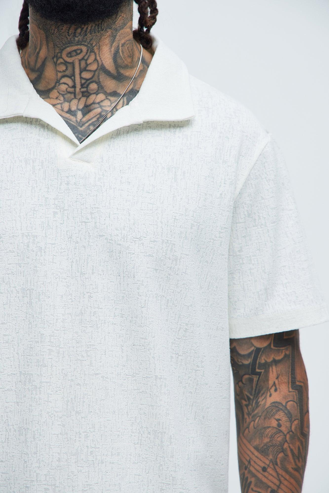 Available In Off White. Fold Down Collar Short Sleeve Textured Detail Bottom Side Slit 80% Cotton 14% Polyester 6% Spandex Imported California Proposition 65 WARNING: Cancer and Reproductive Harm - www.P65Warnings.ca.gov.