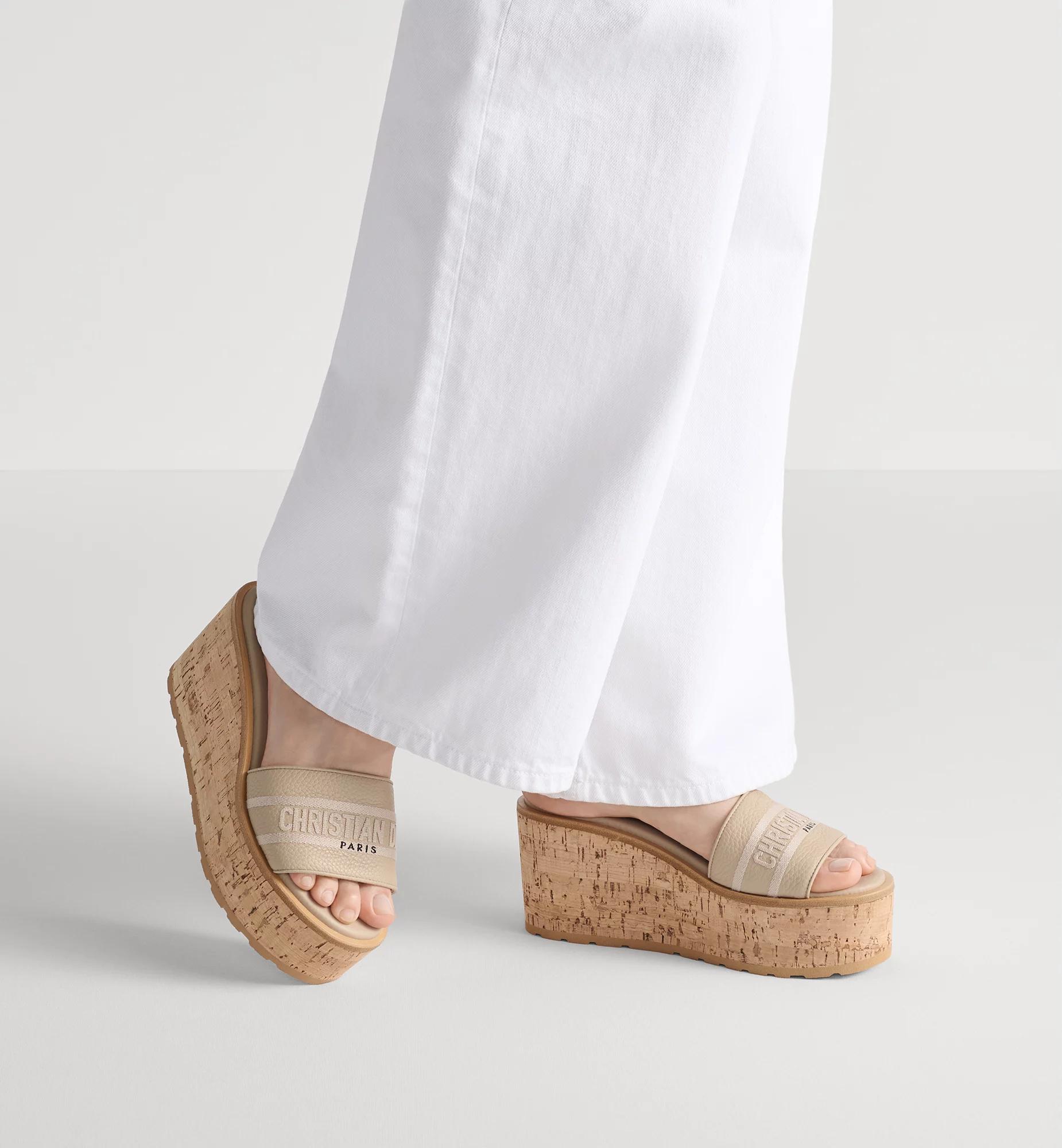 The Dway platform slide showcases a modern and elegant look. The powder beige grained calfskin upper is embroidered with a tonal Christian Dior Paris signature for an instantly recognizable touch. Completed by an ultralightweight cork platform and padded insole for optimum comfort, the shoe will enhance any of the season's outfits. Main composition: calfskin and cotton. Lambskin lining. Christian Dior Paris signature embroidered on the upper. Padded leather insole. Cork platform and thin rubber sole with star, Christian Dior's lucky symbol. Made in Italy
