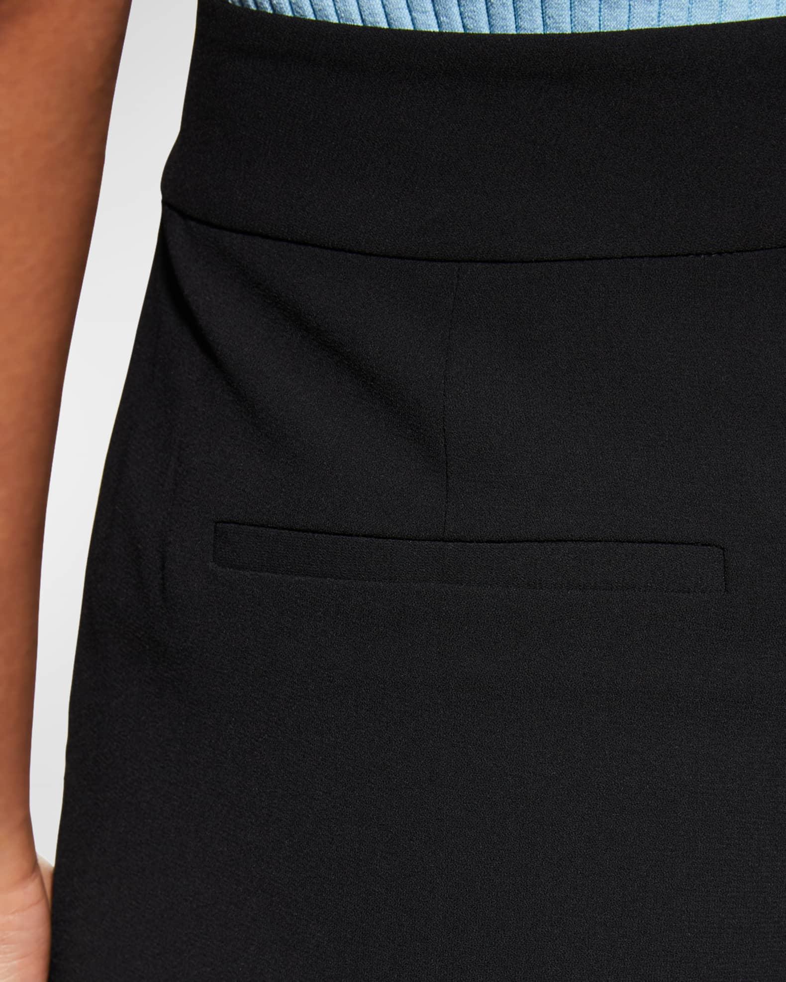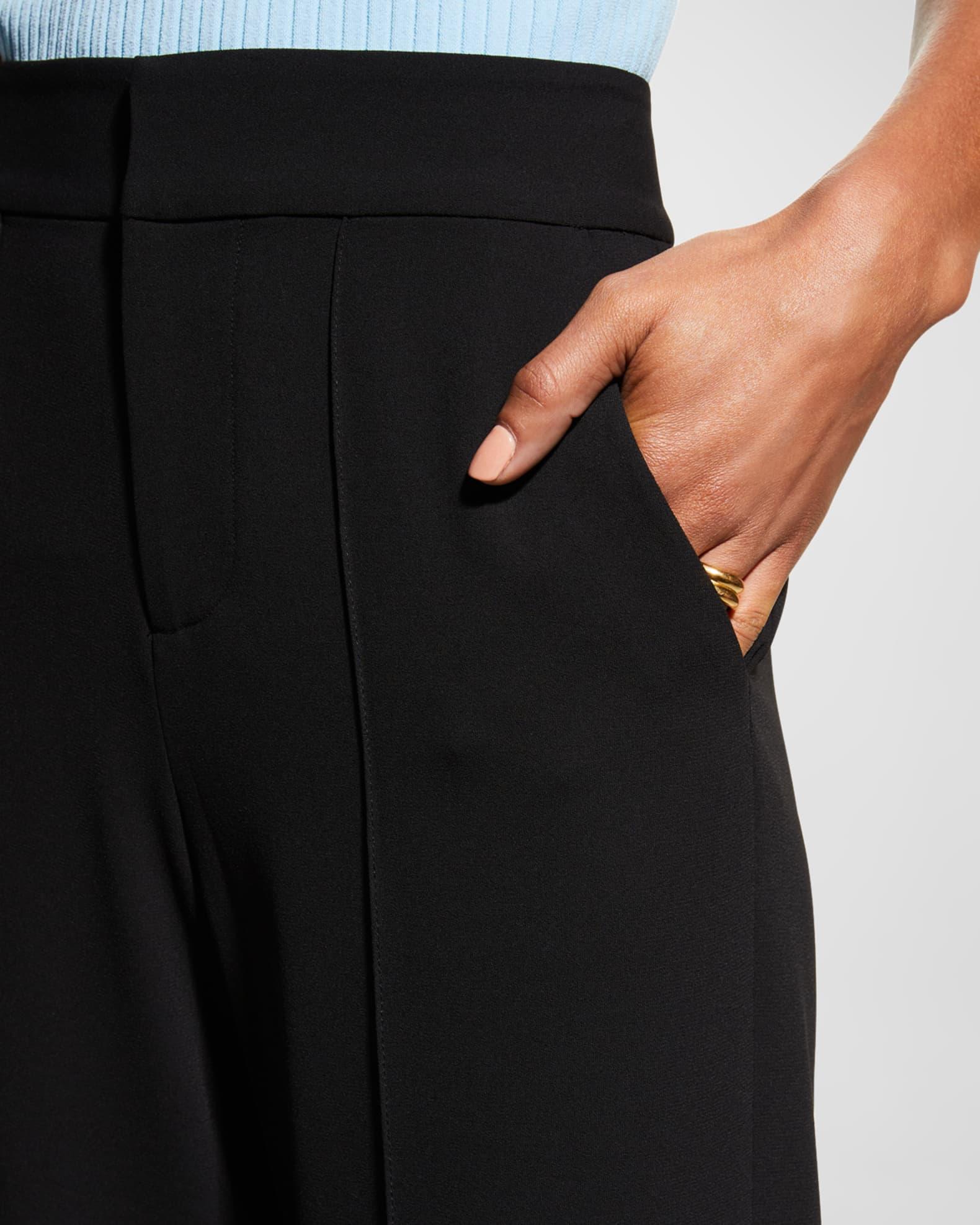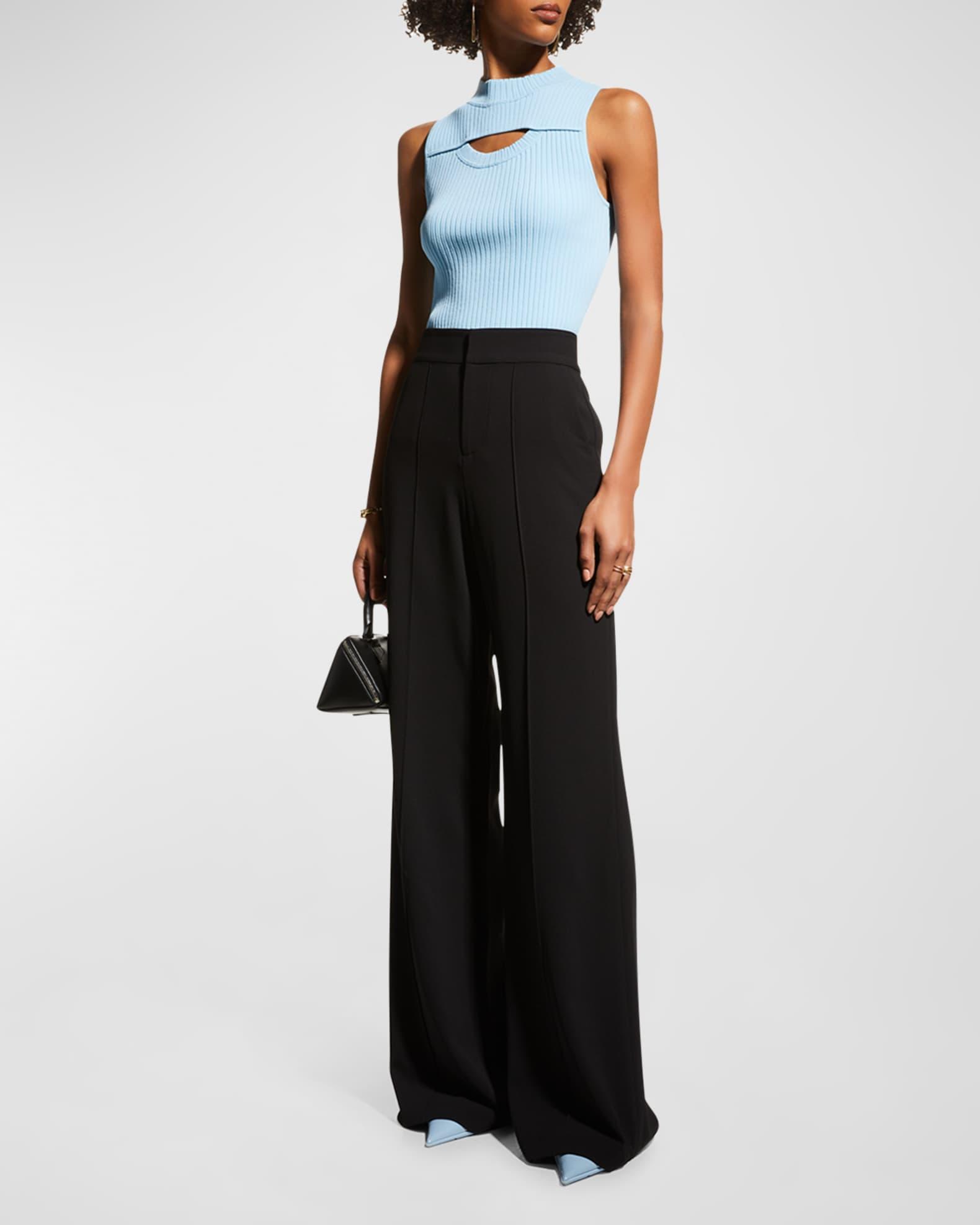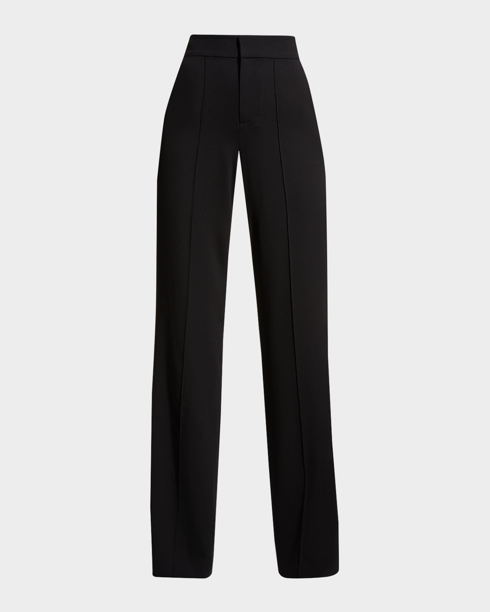 Alice + Olivia "Dylan" pants. Approx. measurements: 9.5" rise; 34" inseam; 45" outseam. High-rise. Wide, flared legs. Back welt pockets. Full length. Hook/zip fly. Polyester; lining, polyester/spandex. Dry clean. Imported. Model is 5'10"/177cm.