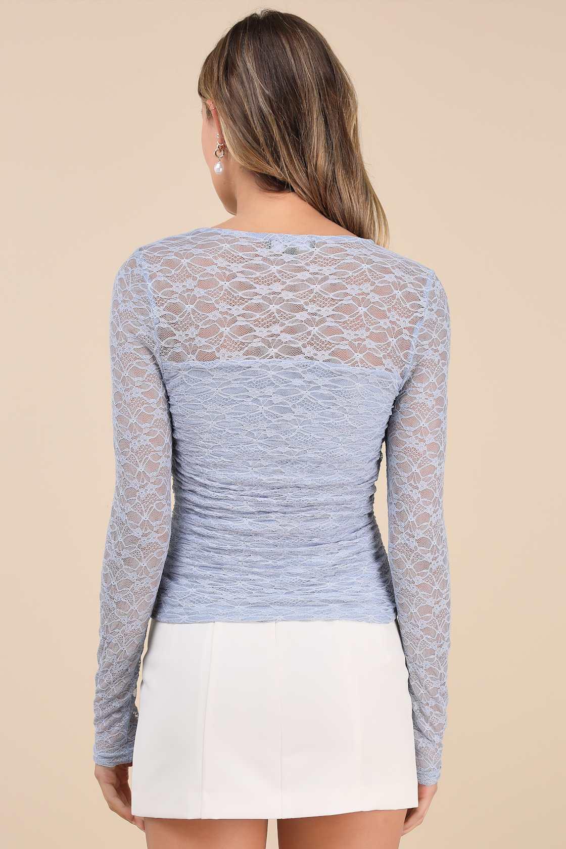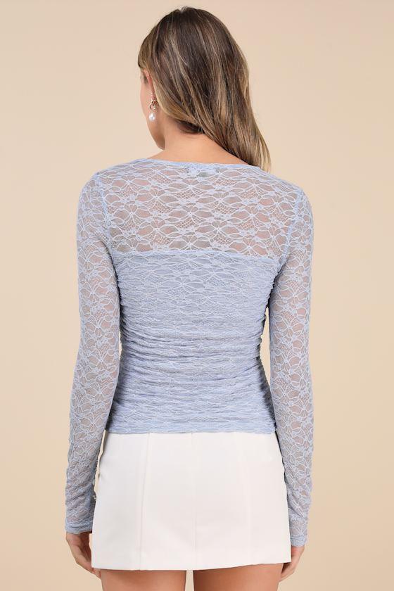 There will always be a compliment heading your way when you style the Lulus Dynamic Charm Periwinkle Blue Lace Cutout Long Sleeve Top! Flirty, lace-like mesh shapes this cute top with a sheer mesh décolletage that flows into fitted, sheer long sleeves. An eye-catching front cutout sits atop the figure-hugging bodice that finishes with a waist-length hem.