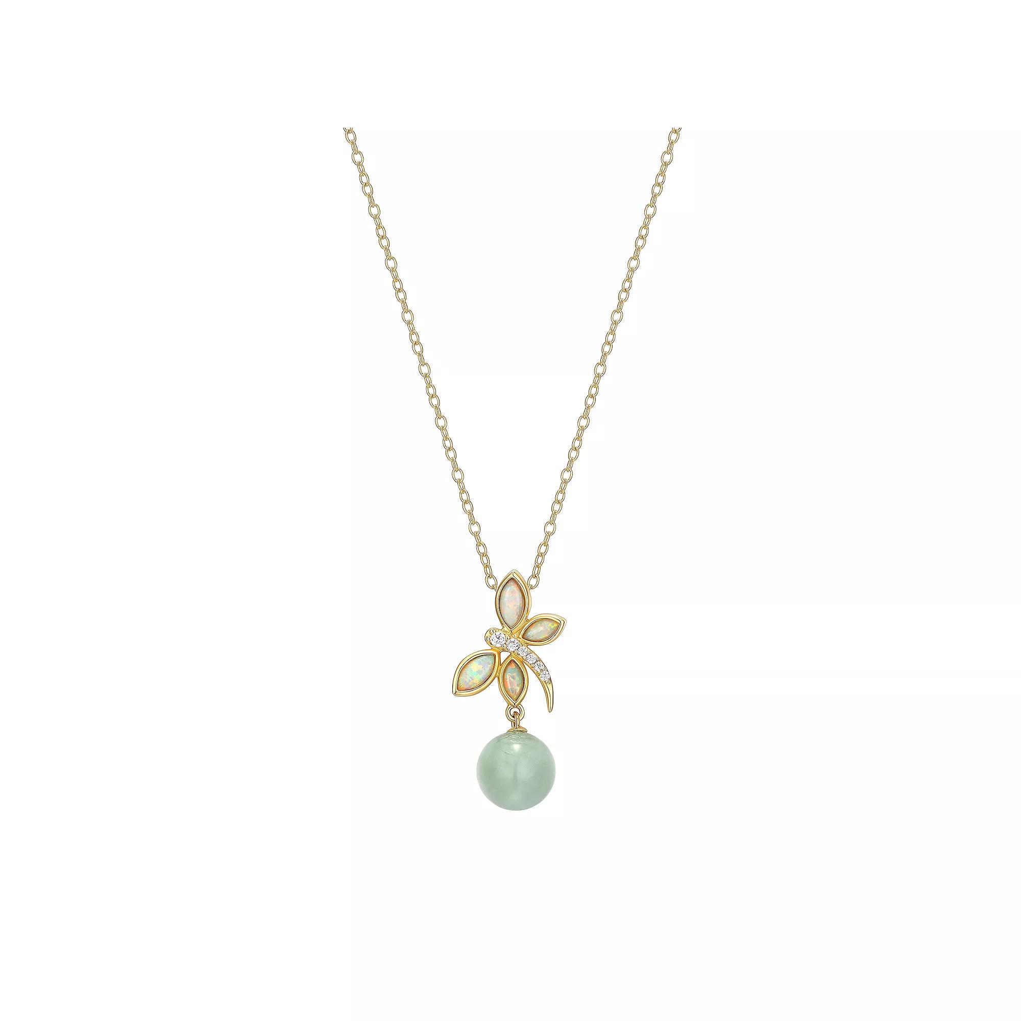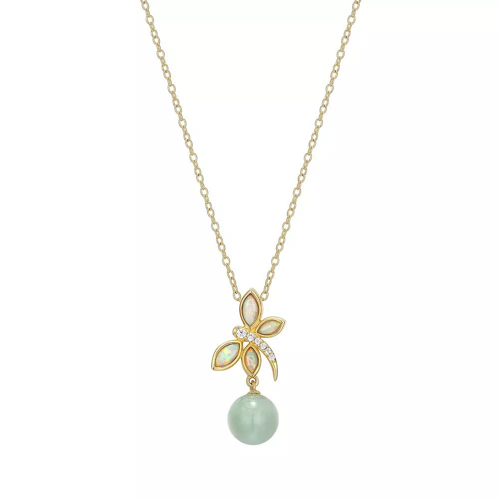 Bring your look to life with this beautiful lab-created opal dragonfly and green jade bead necklace. Click on this JEWELRY & WATCHES GUIDE to learn about fit, styles, materials and more! Bring your look to life with this beautiful lab-created opal dragonfly and green jade bead necklace. Click on this JEWELRY & WATCHES GUIDE to learn about fit, styles, materials and more! FEATURES Drop length: 1 Chain length: 18 in. Chain type: cable Metal: sterling silver Plating: 18k gold Finish: polished Nickel free Packaging: boxedSTONE DETAILS Stone type: cubic zirconia, jadeite jade, lab-created opal Total weight: 4 ct. Center stone size: 8 mm Shape: bead, marquise, round Setting: glue/epoxy, pave Gemstones may have been treated to enhance their appearance. Special care may be required. Please visit our Gemstone Treatment & Special Care Guide for more information. Please note, due to the high value of this item, a signature may be required upon delivery. Size: 18. Gender: female. Age Group: adult.